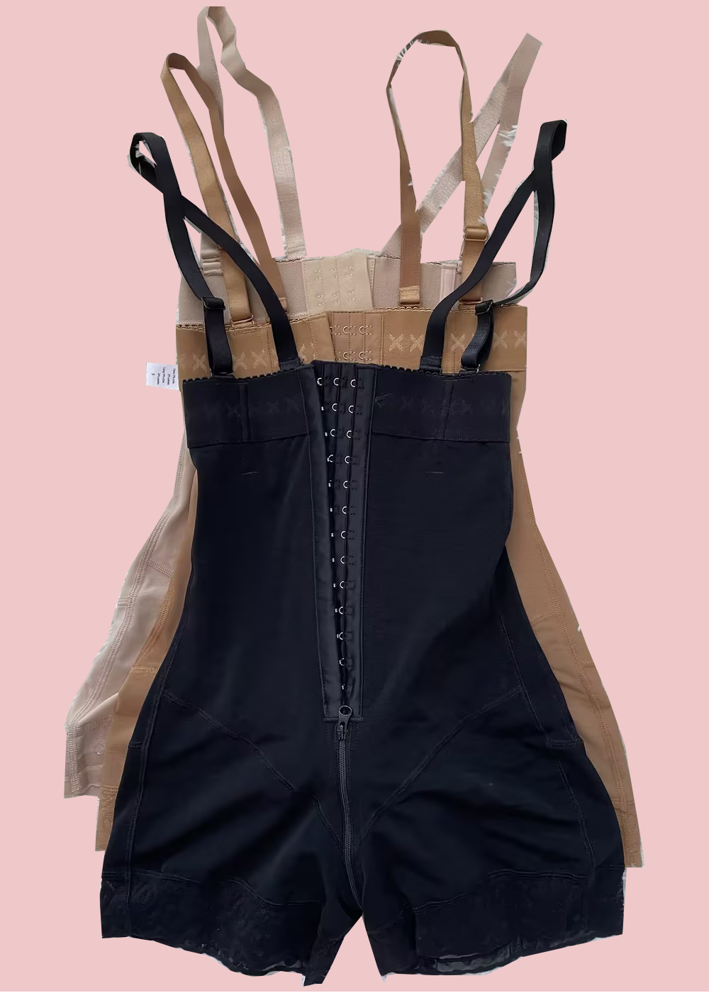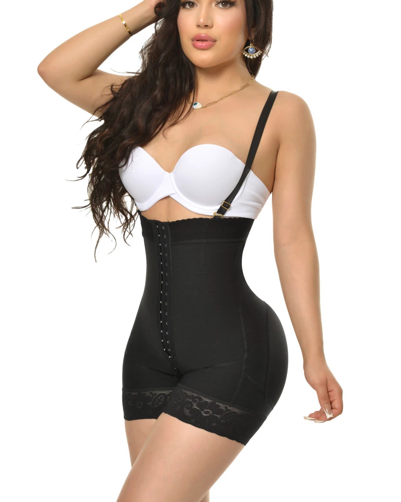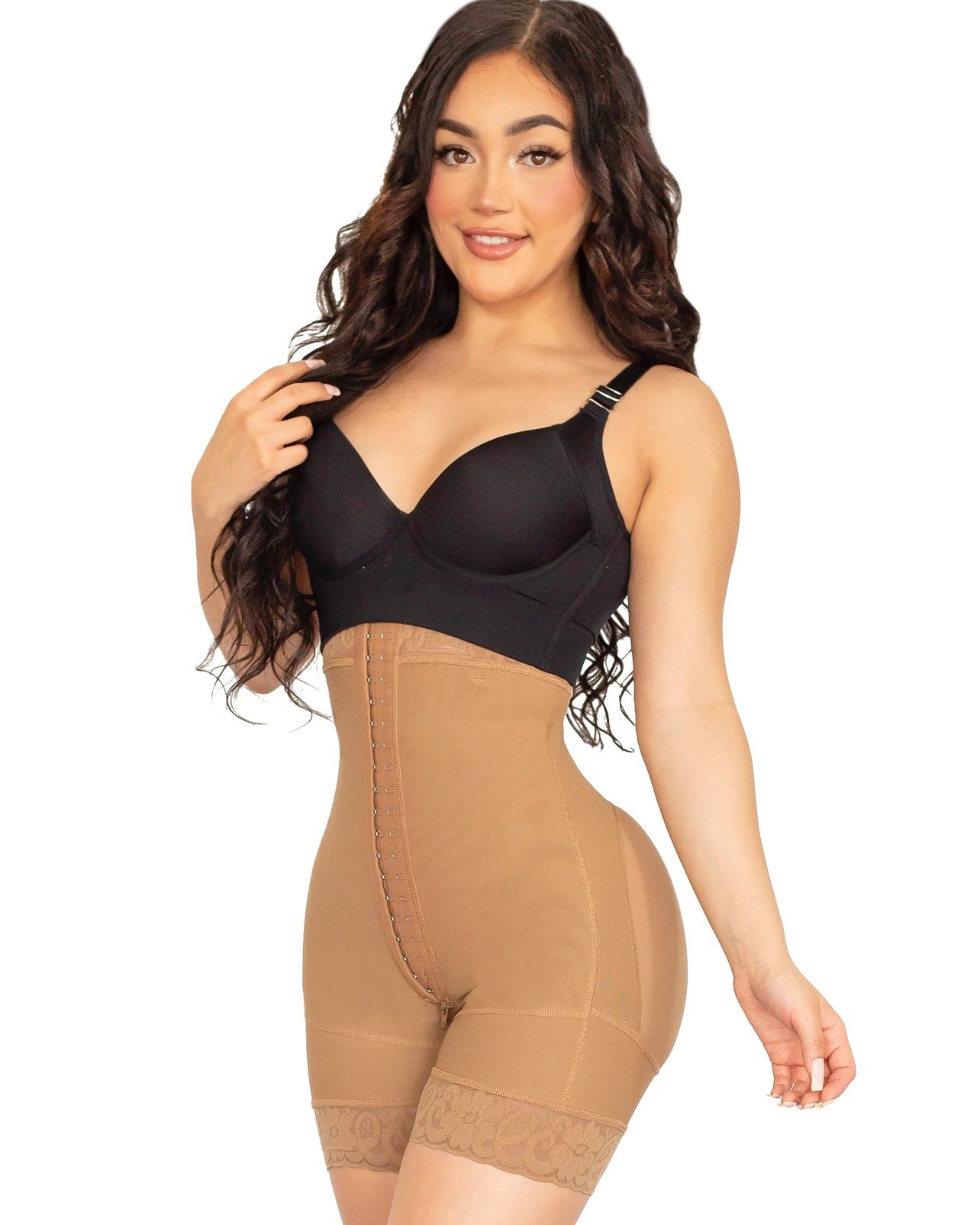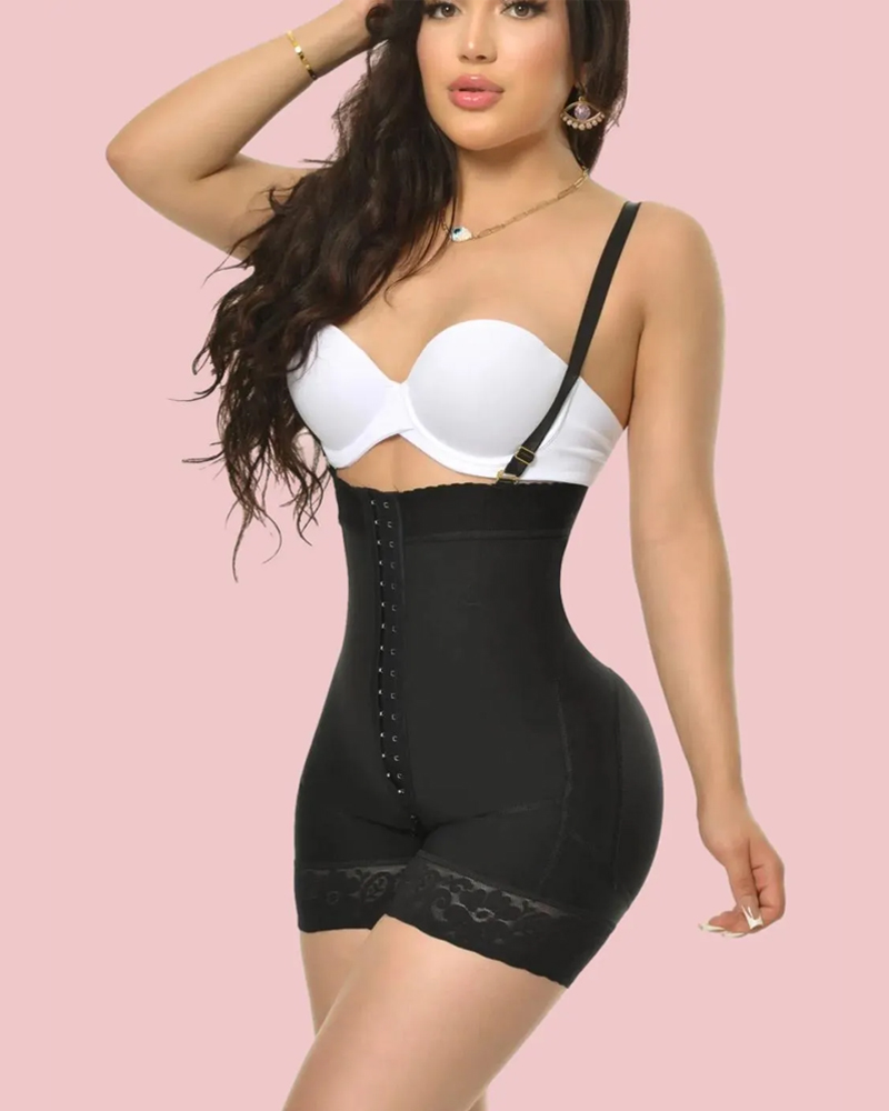 A strapless short-leg faja with removable straps, this faja comes with an extreme butt lift, high stomach compression, silicone band, and lace to prevent it from rolling up or down, perineal zipper for comfort when going to the restroom. Perfect for women with natural bodies