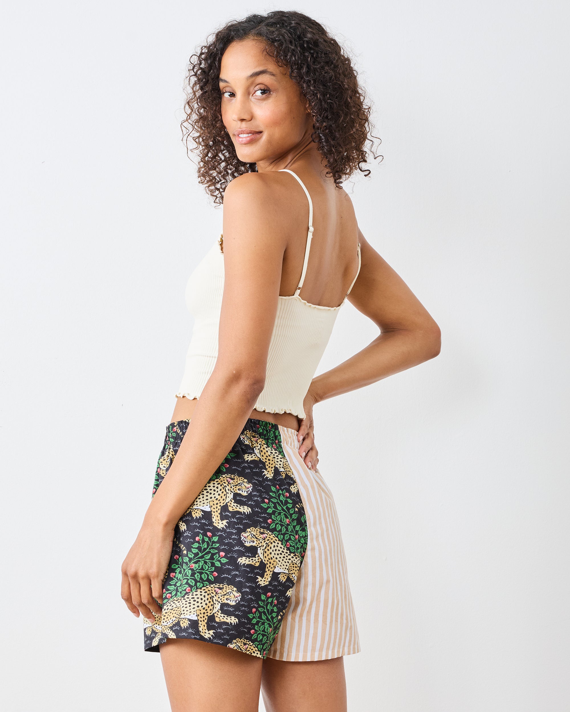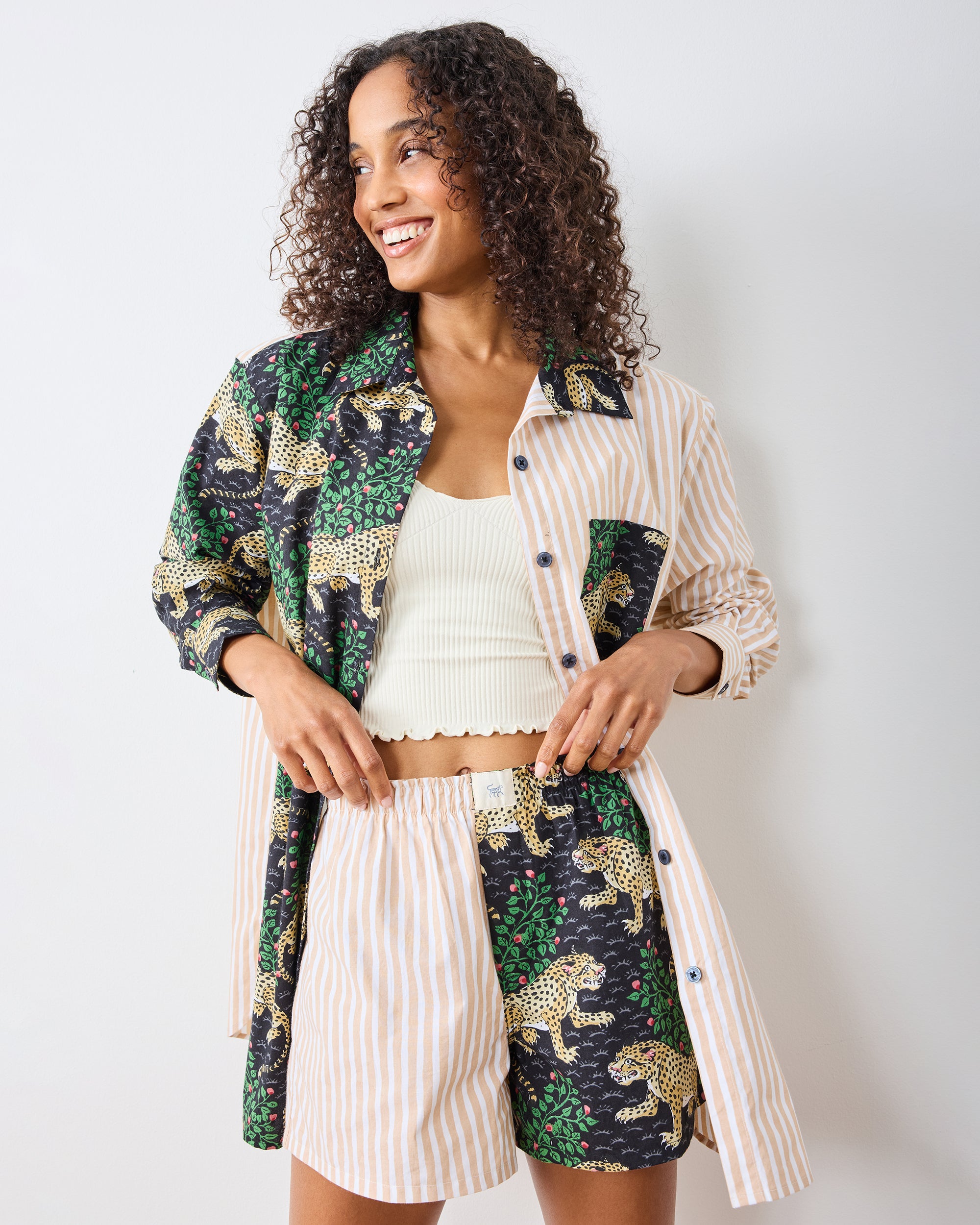 Step into your power with our Bagheera cotton sleep shorts in rich Ink. These leopard boxer shorts feature our iconic print inspired by vintage paintings. Made from breathable organic cotton, these women’s cotton boxers feature a relaxed sleep shorts silhouette, perfect for layering under your favorite robe. Explore more , , and pieces.