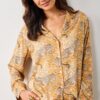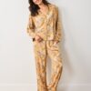 Meet our fierce , inspired by vintage paintings of majestic jungle cats. Crafted in tobacco-hued Eco Satin, this slim-fit pajama set features elegant notched details on both sleeves and pants, with a longer top length for comfortable coverage. Perfect for evenings spent lounging in your private sanctuary. Explore our and for more vibrant hand-drawn prints.