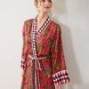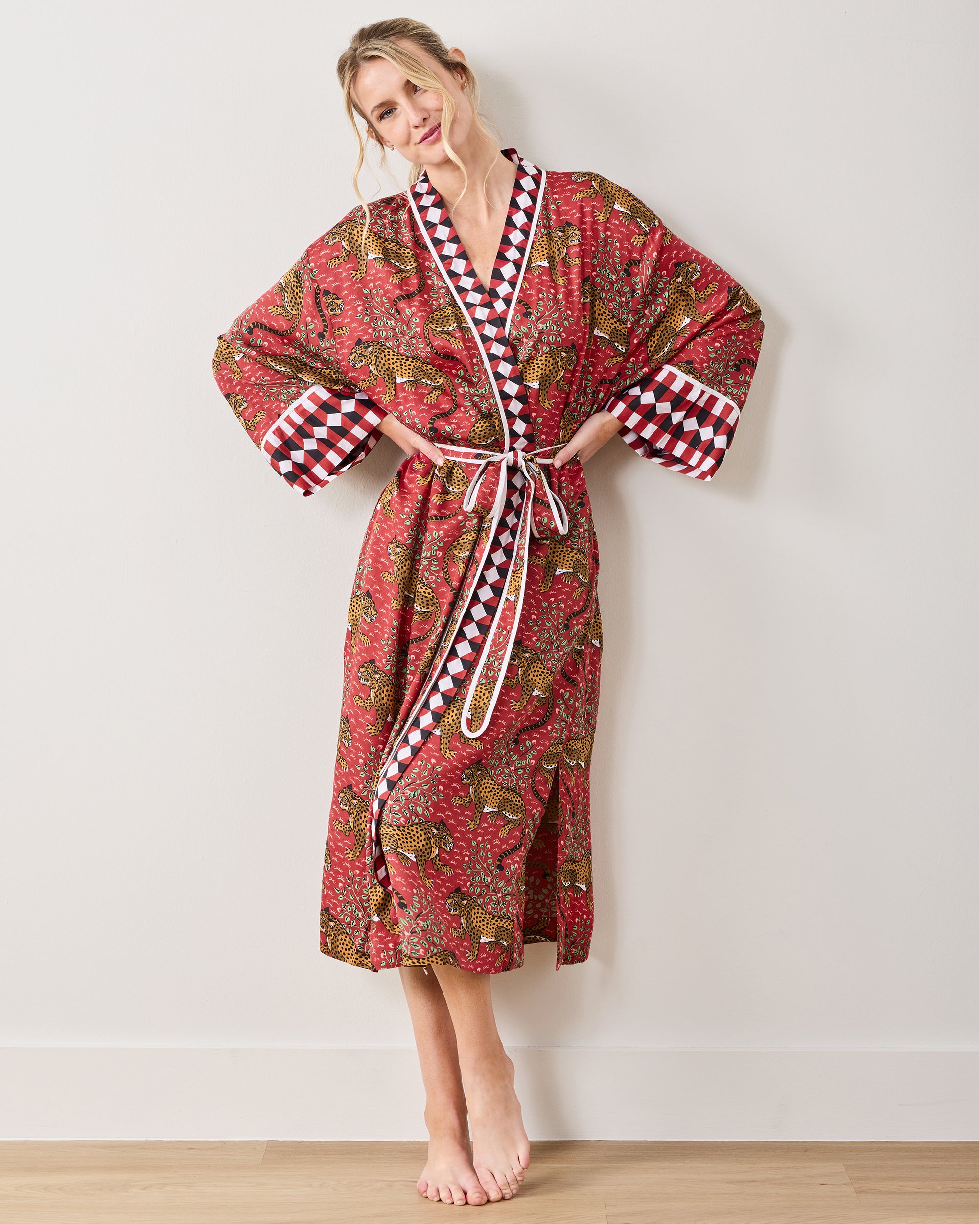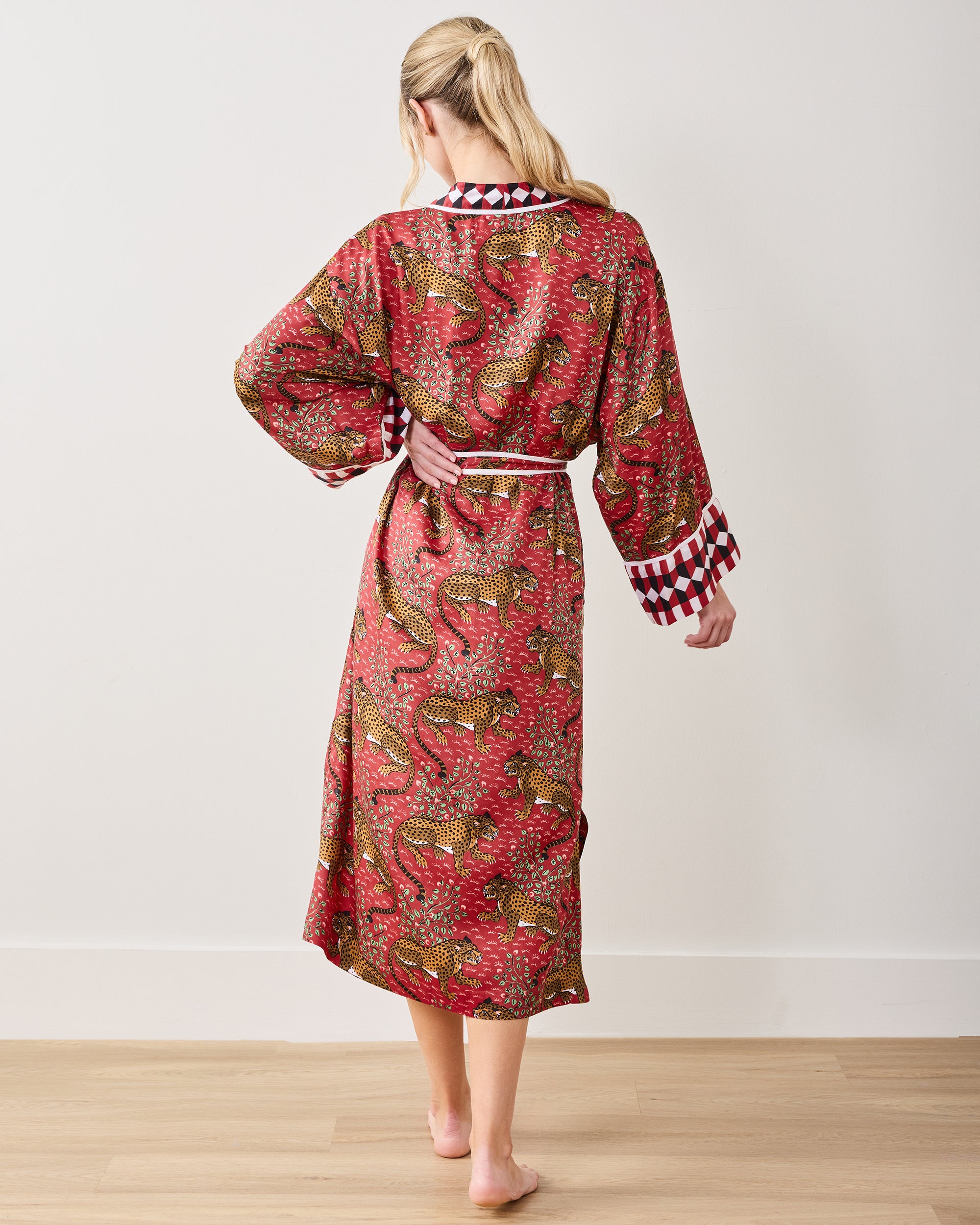 Channel vintage glamour in our Bagheera leopard print robe in rich Scarlet. Inspired by antique paintings of jungle cats and decorative flora, this silky Eco Satin robe offers luxurious full-length coverage with deep pockets and a matching belt. The relaxed silhouette layers beautifully over our , creating a luxury lounge set for your morning routine. Explore our and collections for more coordinated styles.