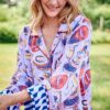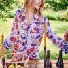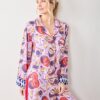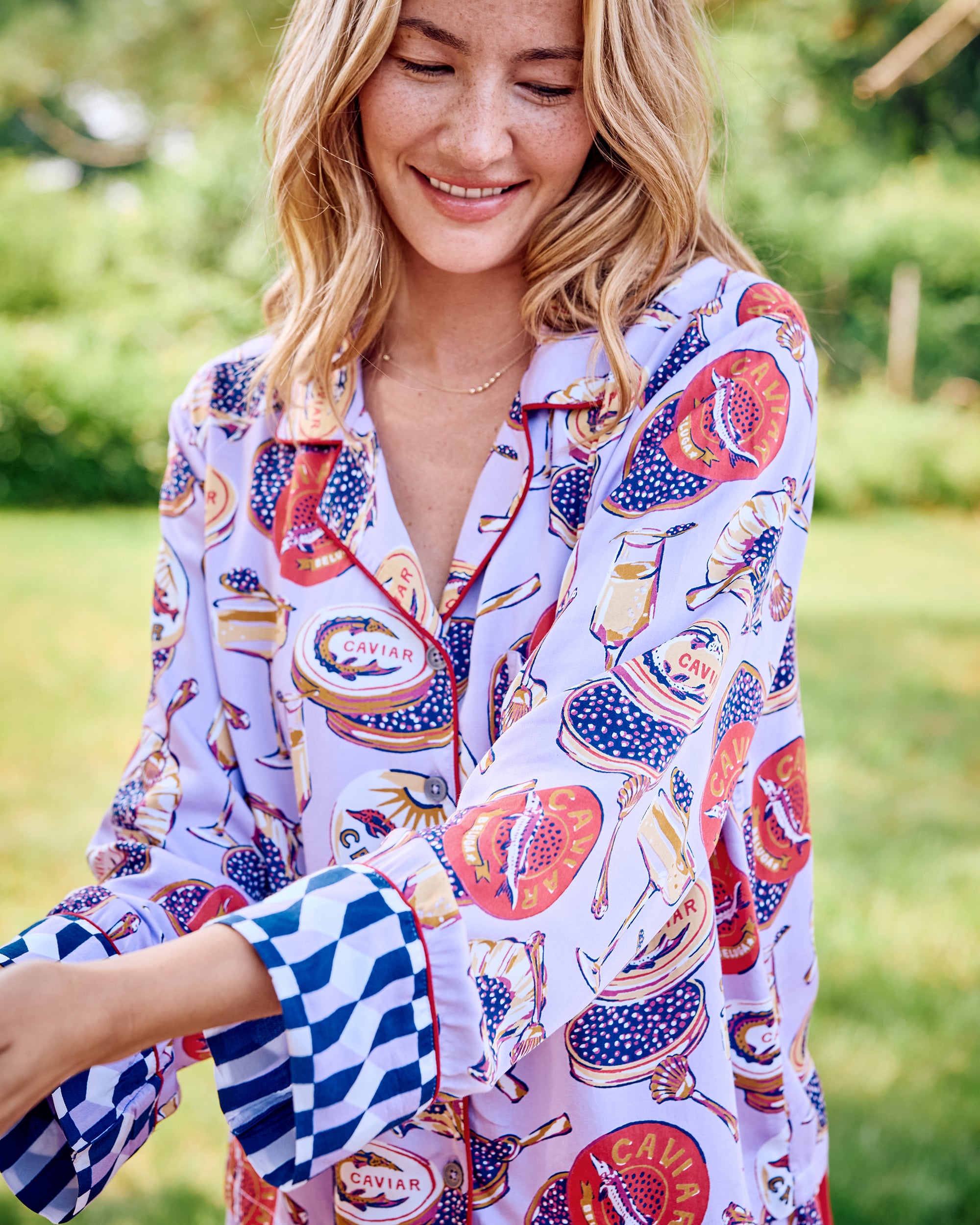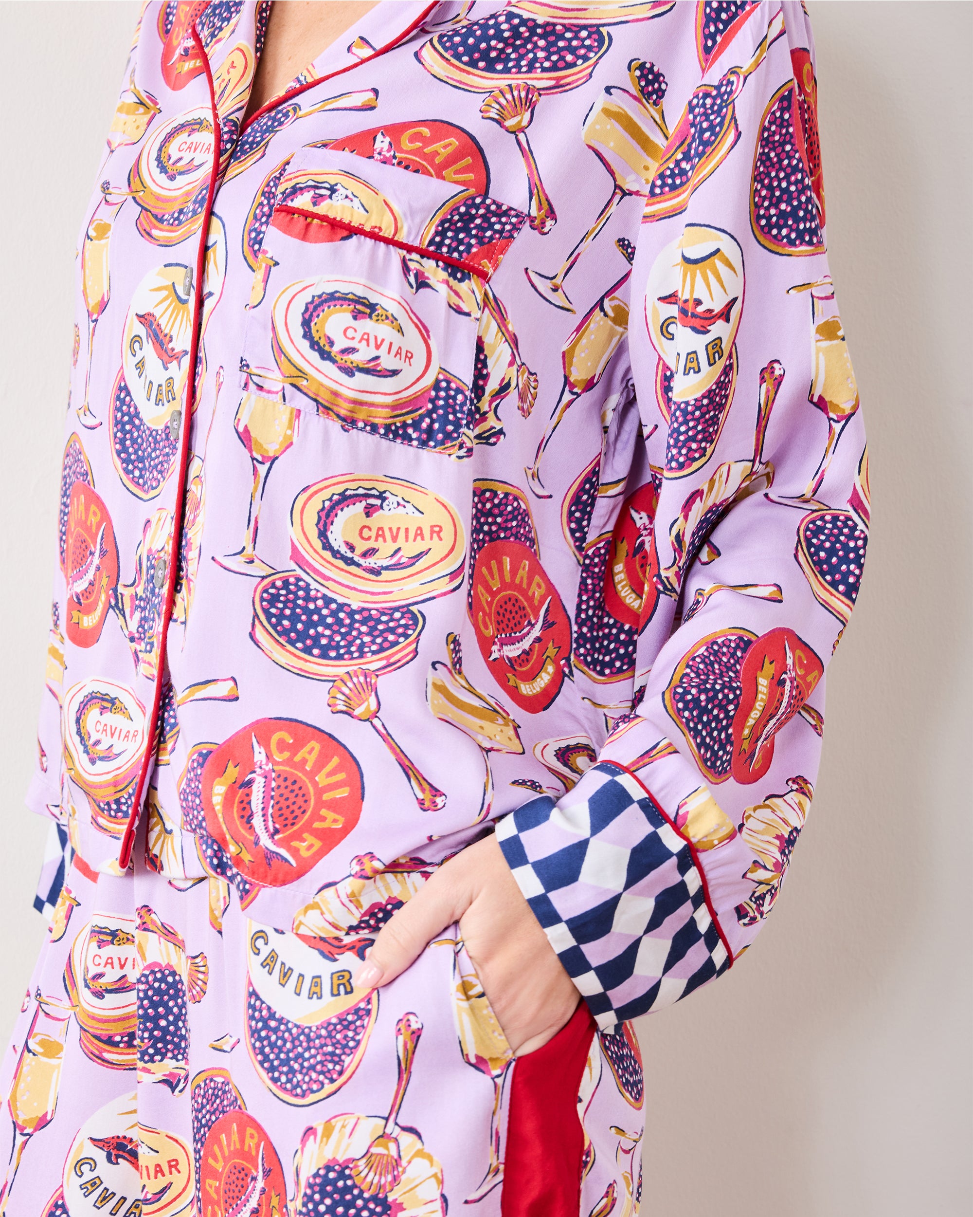 Pop the cork on bedtime luxury with this champagne print sleepwear in dreamy Lavender Spritz. Our Rittenhouse satin lounge set features vintage-inspired caviar tins and bubbly flutes on silky Eco Satin. The relaxed-fit top and high-rise wide-leg pants include pockets for midnight champagne moments. Perfect for celebrating quiet victories or gift-giving. Explore our , , and for more luxe pieces.