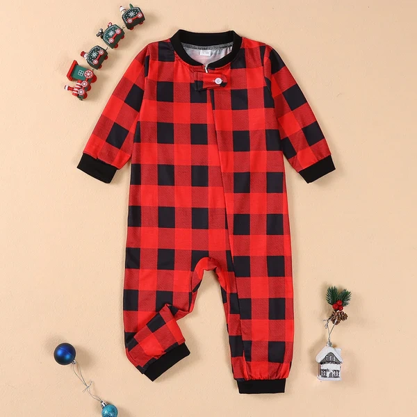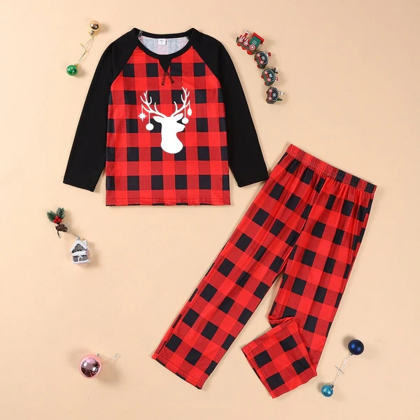 Christmas Family Pajamas Matching Set Long Sleeve Elk Print T-shirt with Plaid Trousers