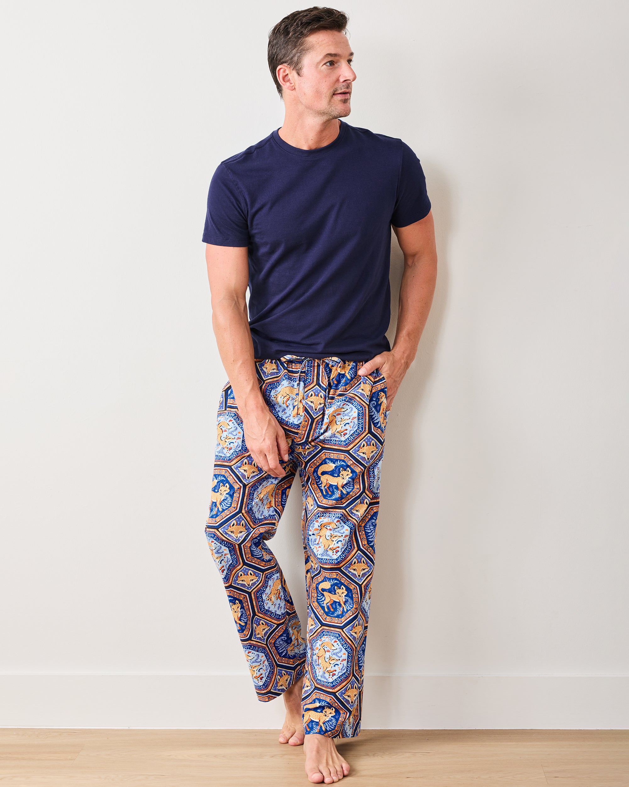 Bring woodland charm to bedtime with our Fancy Fox men’s PJ pants in French Blue. Inspired by ornate mosaic tilework, this playful print features dapper foxes on soft organic cotton. These relaxed-fit fall pajama bottoms include deep pockets and an adjustable drawstring waist for easy comfort. Perfect for fireside reading or autumn movie nights. Explore more cotton men’s loungewear in our men’s collection and pajamas.