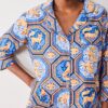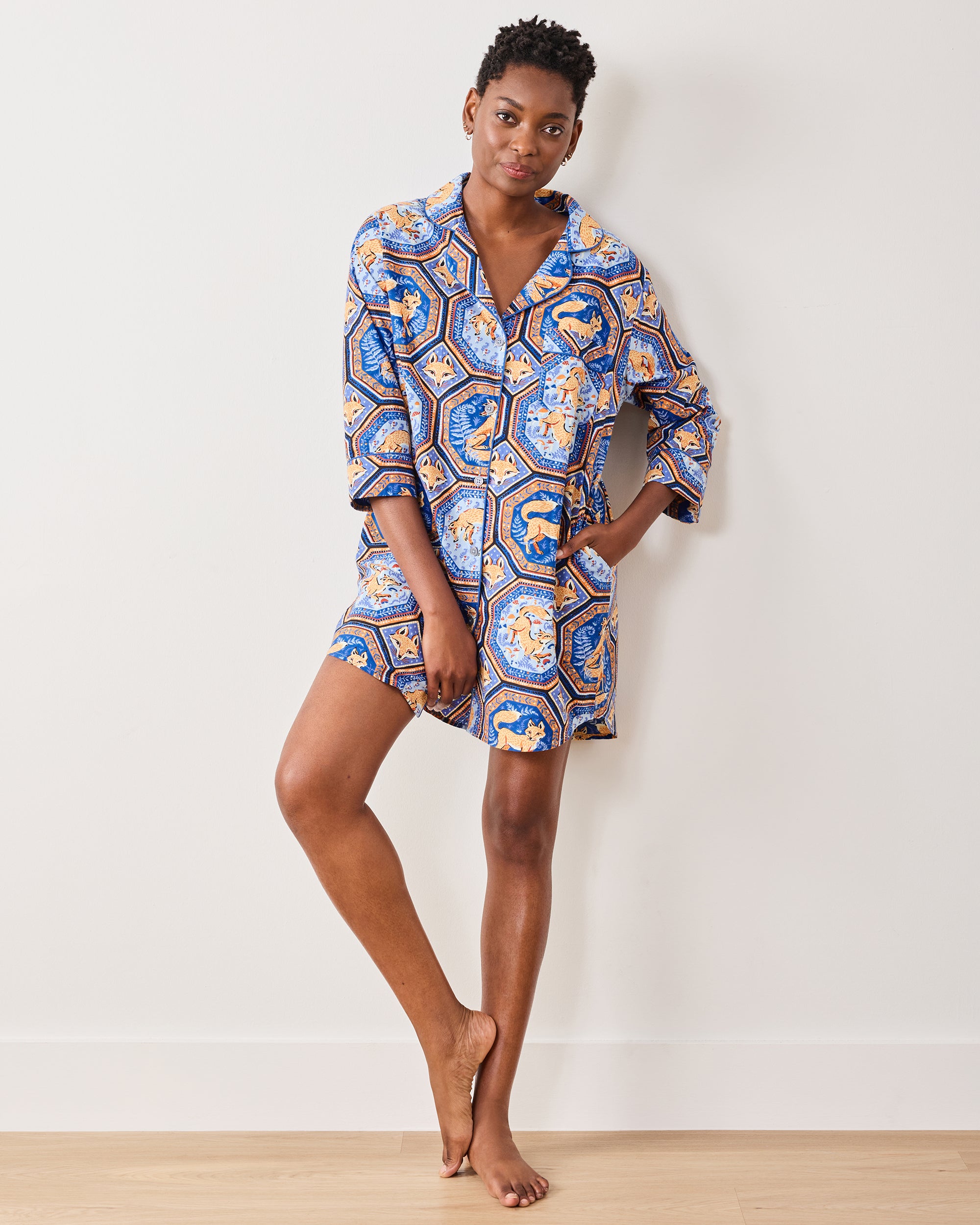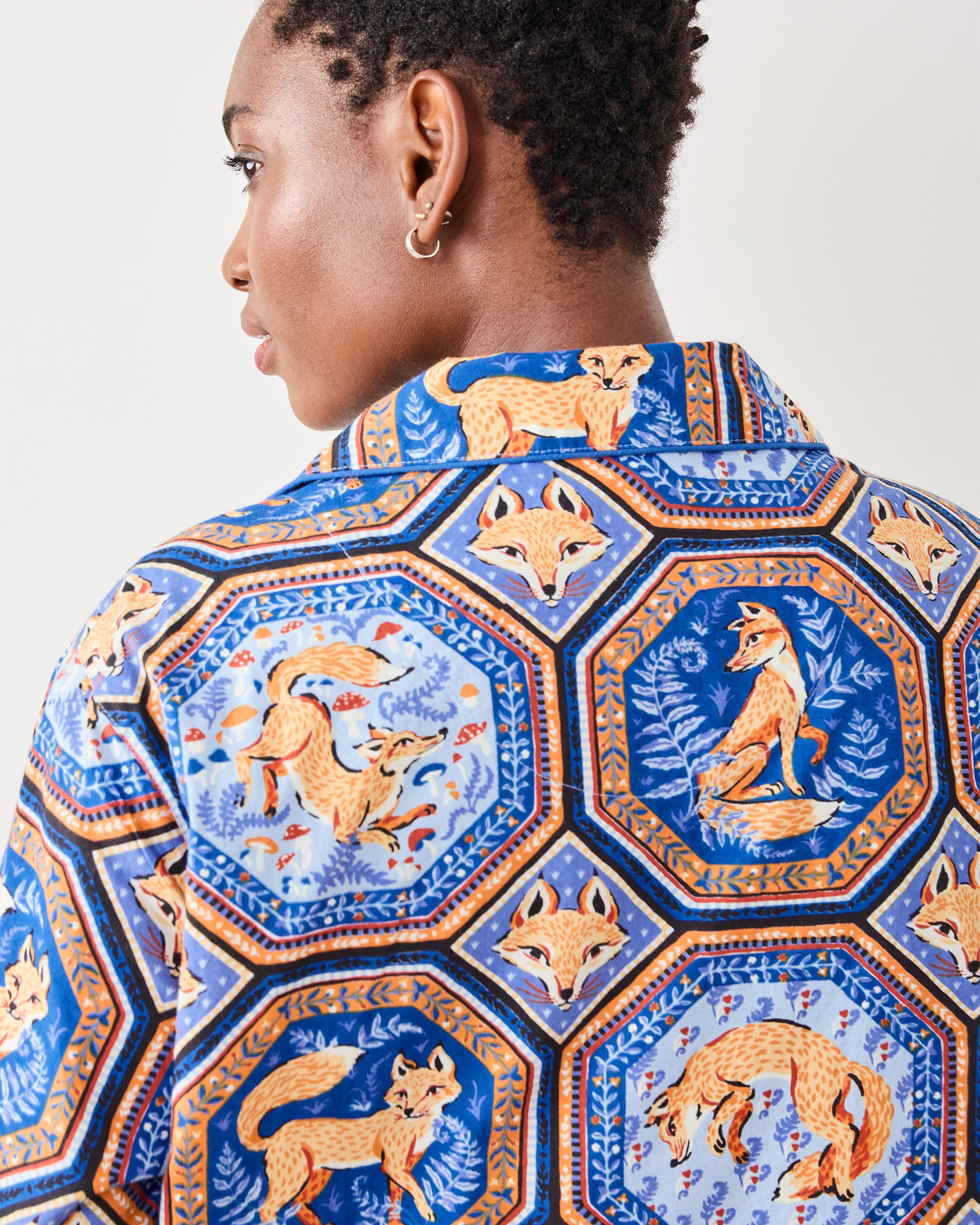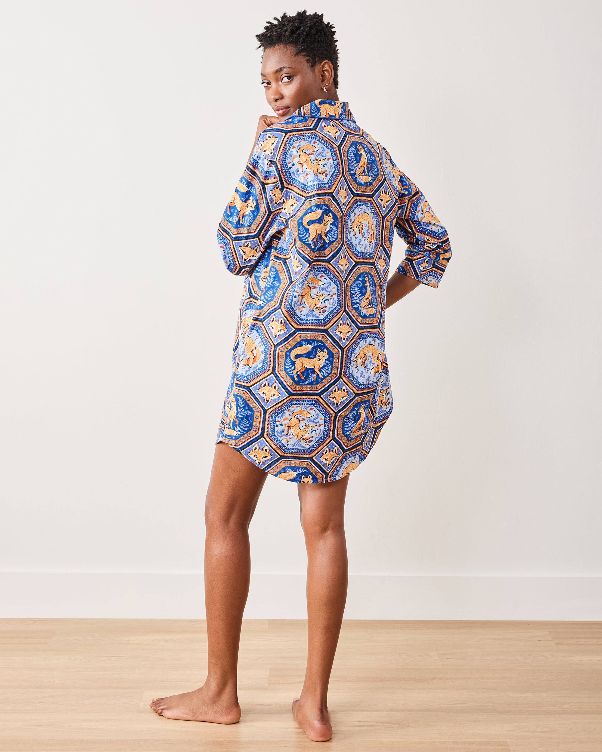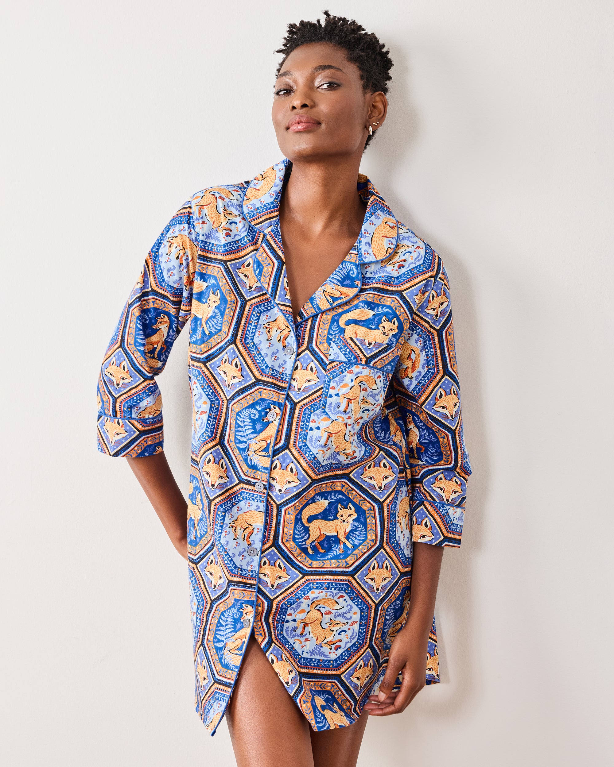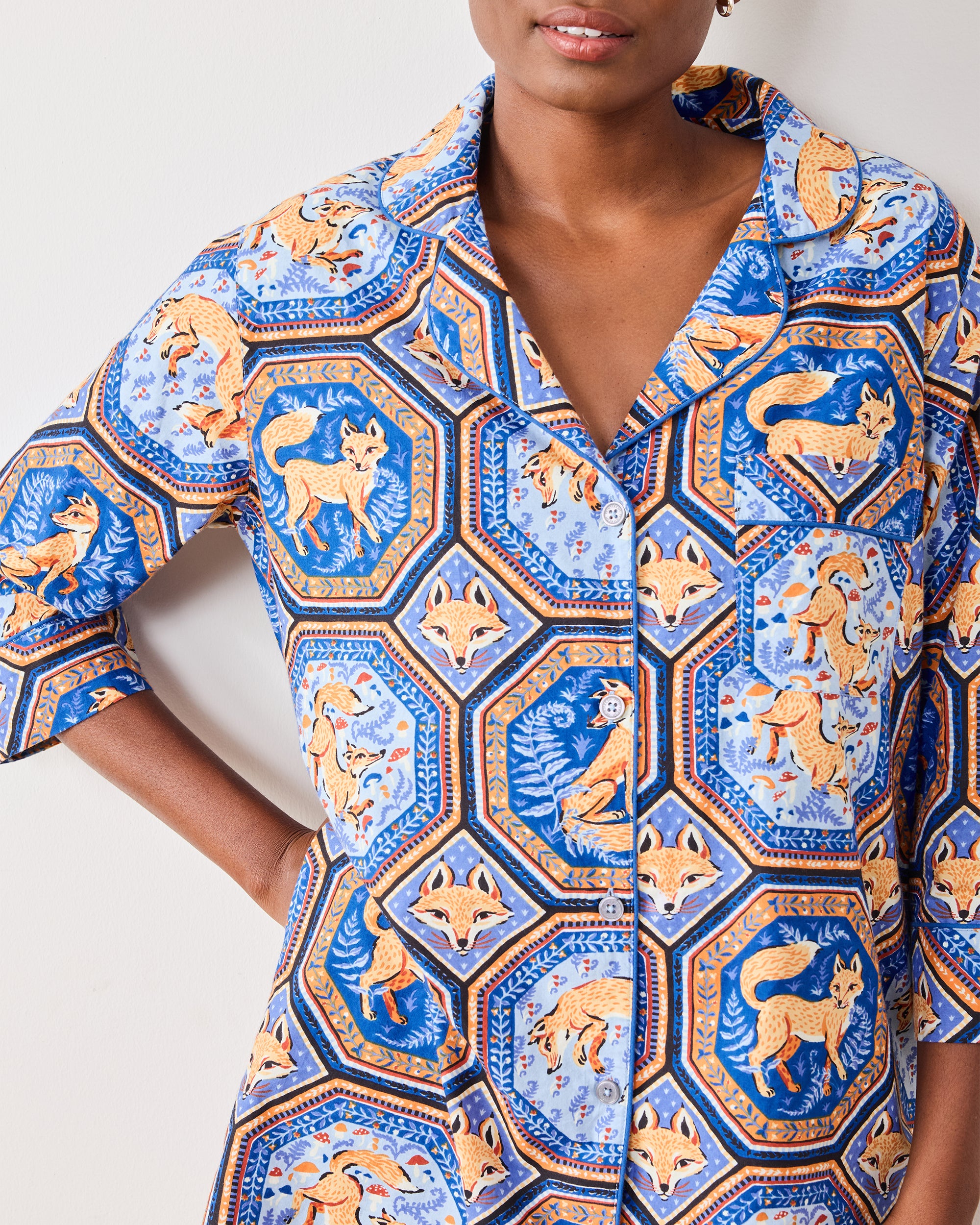 Fancy Fox brings mosaic-inspired elegance to bedtime with dapper foxes dancing across organic cotton. This blue nightshirt features an easy-wearing button-down silhouette, versatile three-quarter sleeves, and pockets for your nighttime essentials. Perfect for curling up with autumn reads or late-night journaling sessions. The knee-length coverage makes this fox print sleep shirt a cozy companion for all seasons. Explore more sleep shirts and pajamas.