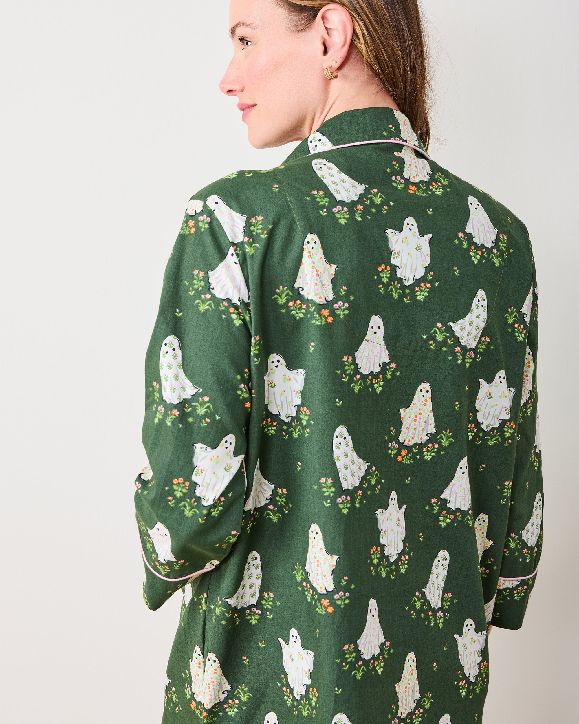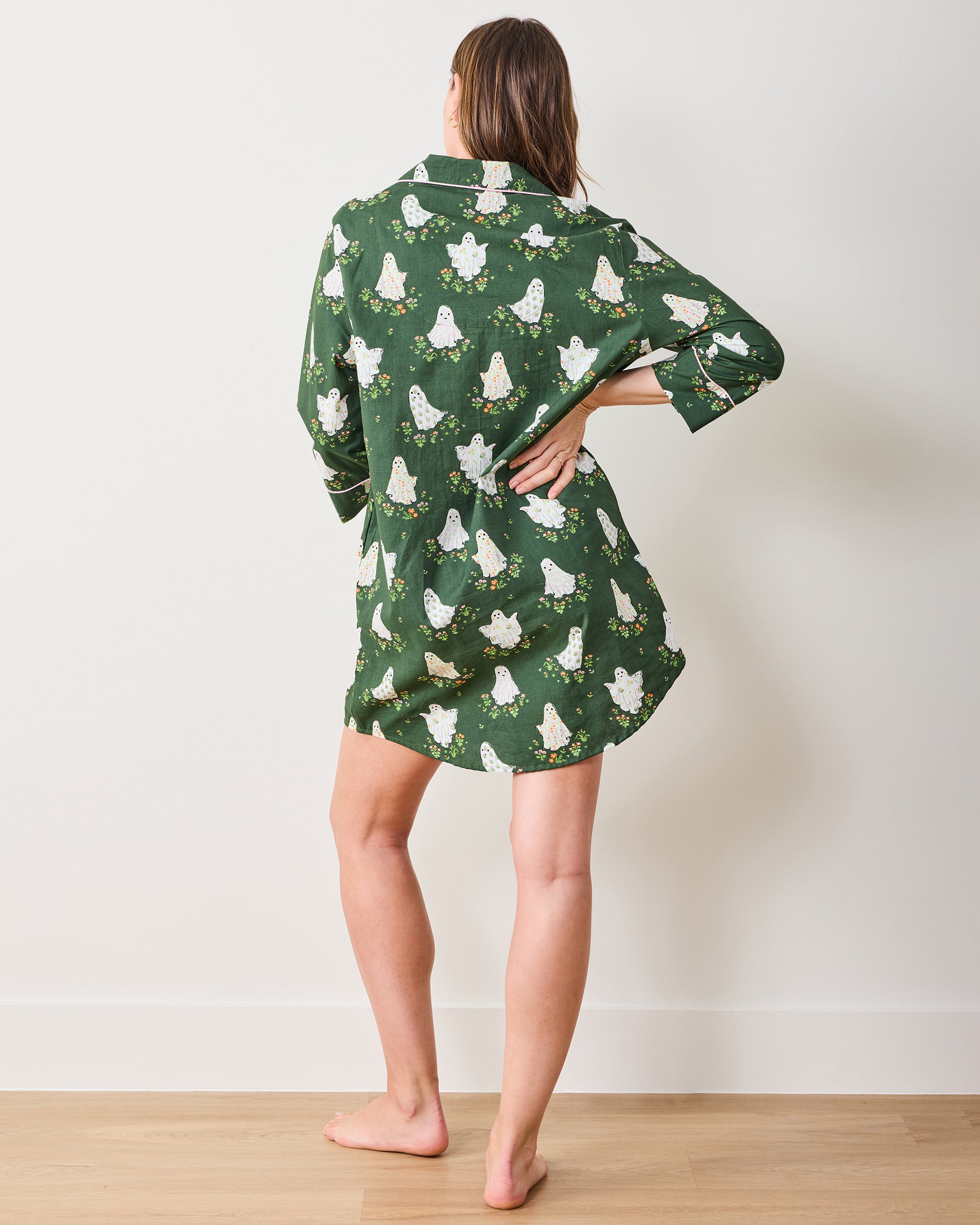 Wake refreshed in our Gardening Ghosts sleep shirt. This ghost print sleep shirt wraps you in breathable organic cotton that softens with every wash. It features a chic button-down design with 3/4 sleeves and deep pockets for your nighttime essentials. Our Halloween sleepwear brings a nature-inspired twist to ghost pajamas, with subtle seasonal charm. Explore more in our sleep shirts and pajamas.
