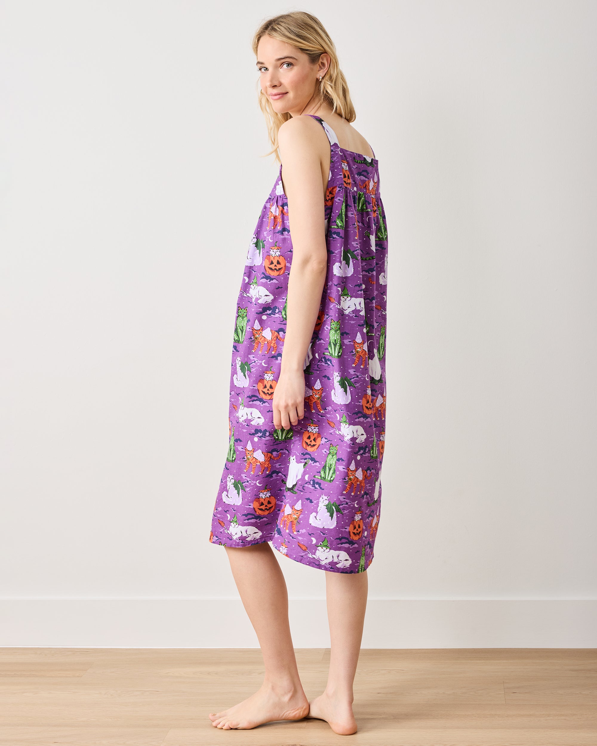Refresh your fall sleepwear with our Halloween House Cats cotton sleep dress. Breathable organic cotton keeps you comfortable through October nights, with a relaxed midi-length silhouette for easy movement. Thoughtful details like lace trim and pockets make this the perfect fall sleepwear for cozy movie marathons and late-night treats. Explore our and for more vibrant hand-drawn prints.