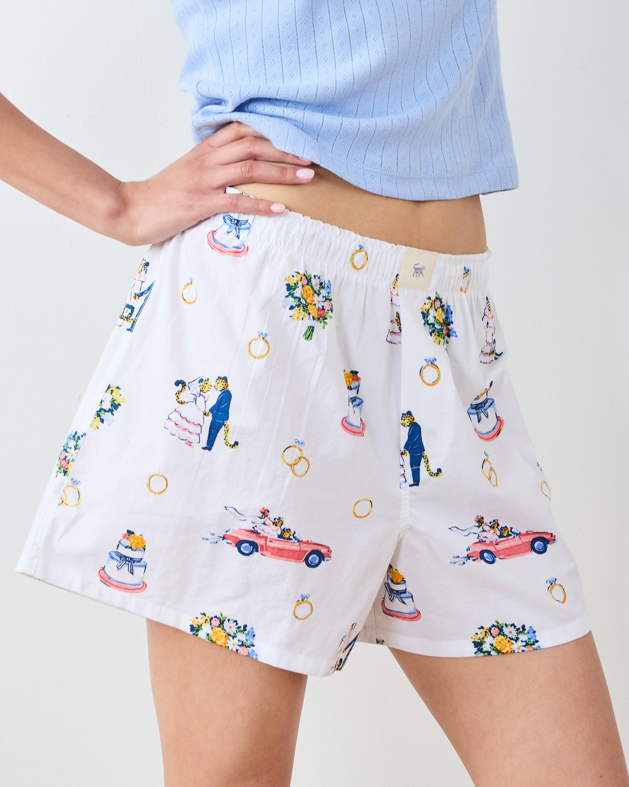 Begin your next chapter in these dreamy Happily Ever After cotton sleep shorts in soft Cloud. Featuring an adorable Bagheera couple in love, these boyfriend boxers offer breathable cotton comfort, perfect for wedding morning prep and bridal party photos. The romantic white boxer shorts make getting ready feel extra special. Discover more cozy and .