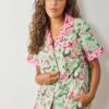 - Sizing: Button-down top with relaxed fit and comfortable silhouette. Mid-rise shorts featuring elastic waistband, adjustable drawstring, and 2 ¼” inseam.