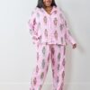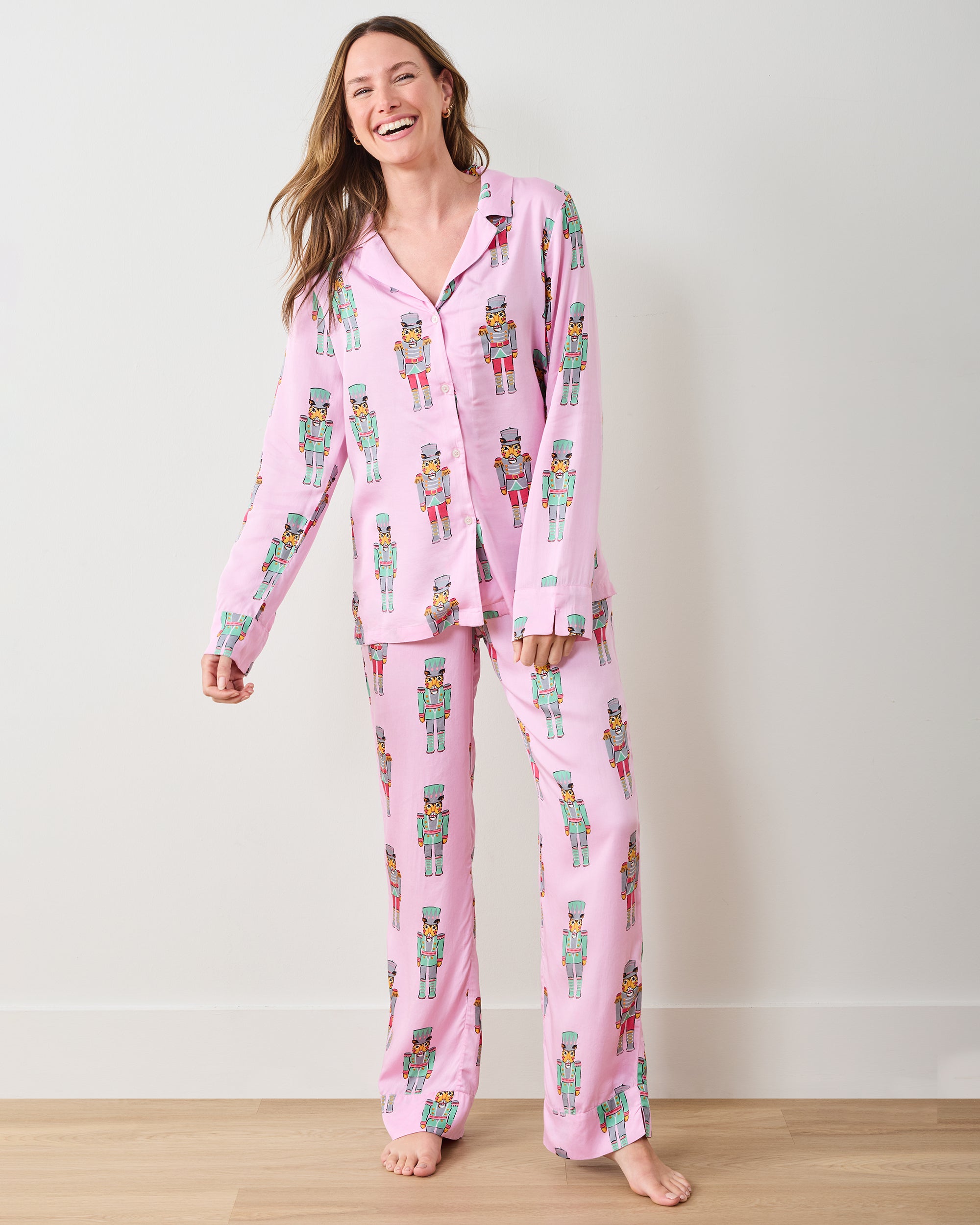 Make this holiday season wildly elegant with our Leopard Nutcrackers satin pajama set in Pink Candy Cane. These festive satin PJs pair fierce leopards with whimsical nutcrackers on luxurious Eco Satin. We made these holiday satin pajamas with a tailored silhouette, full-length pants, and pockets for easy lounging. A perfect gift for the friend who loves wildcats. Explore our , , and .