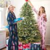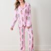 - Sizing: Long pajama set with a fitted silhouette. The long-sleeve button-down top features a slim fit and length designed to hit just below the waist. Mid-rise pants feature an elastic waistband, 28″ inseam, and pockets.