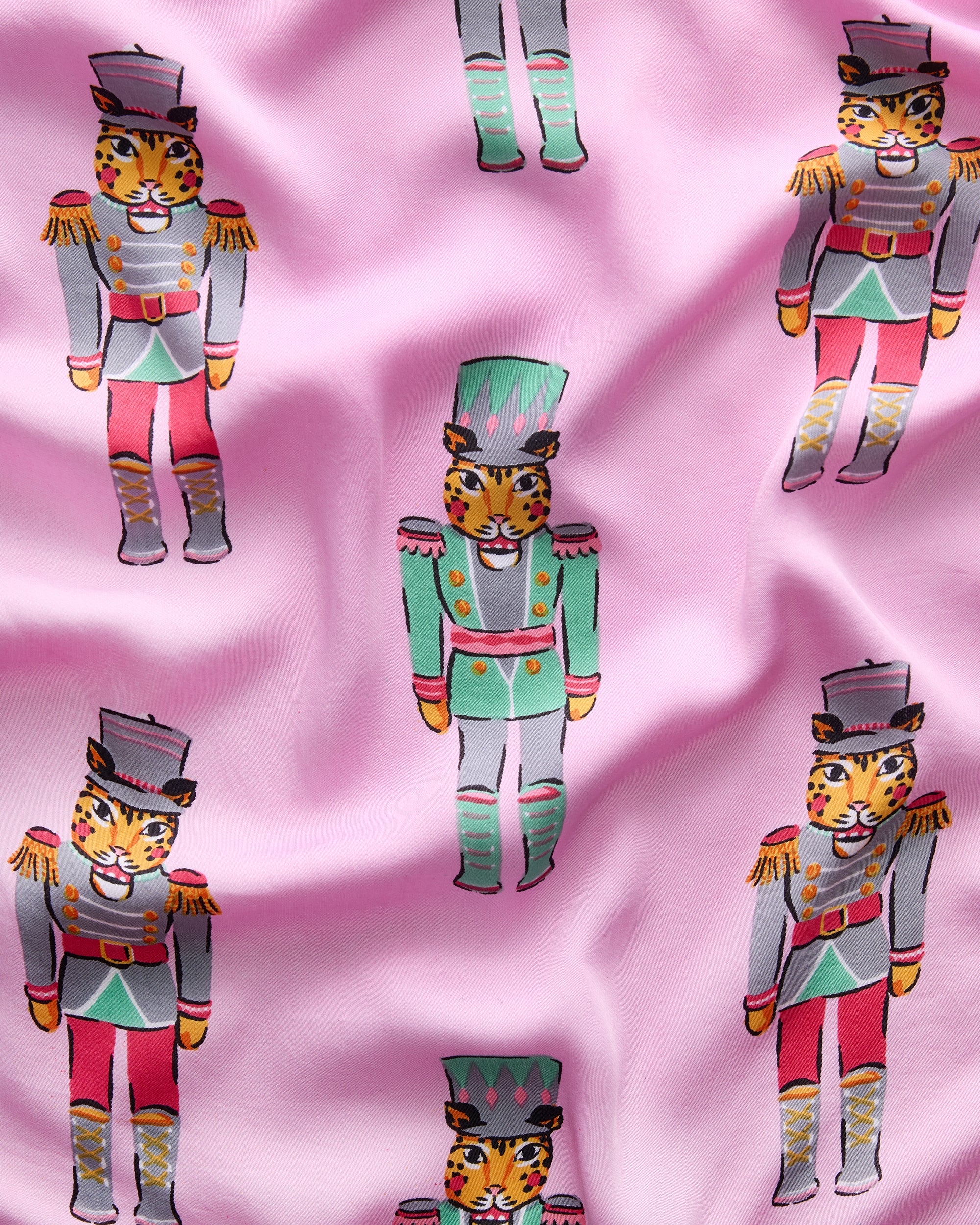 Transform bedtime into a holiday celebration with our Leopard Nutcrackers midi-length satin sleep dress. This festive sleepwear dress pairs whimsical nutcrackers with bold leopard faces on thermoregulating Eco Satin. The holiday satin nightie features adjustable straps with a stretchy smocked back and an elegant side slit for easy movement. Made for magical December nights. Explore our , , and for more hand-drawn prints.