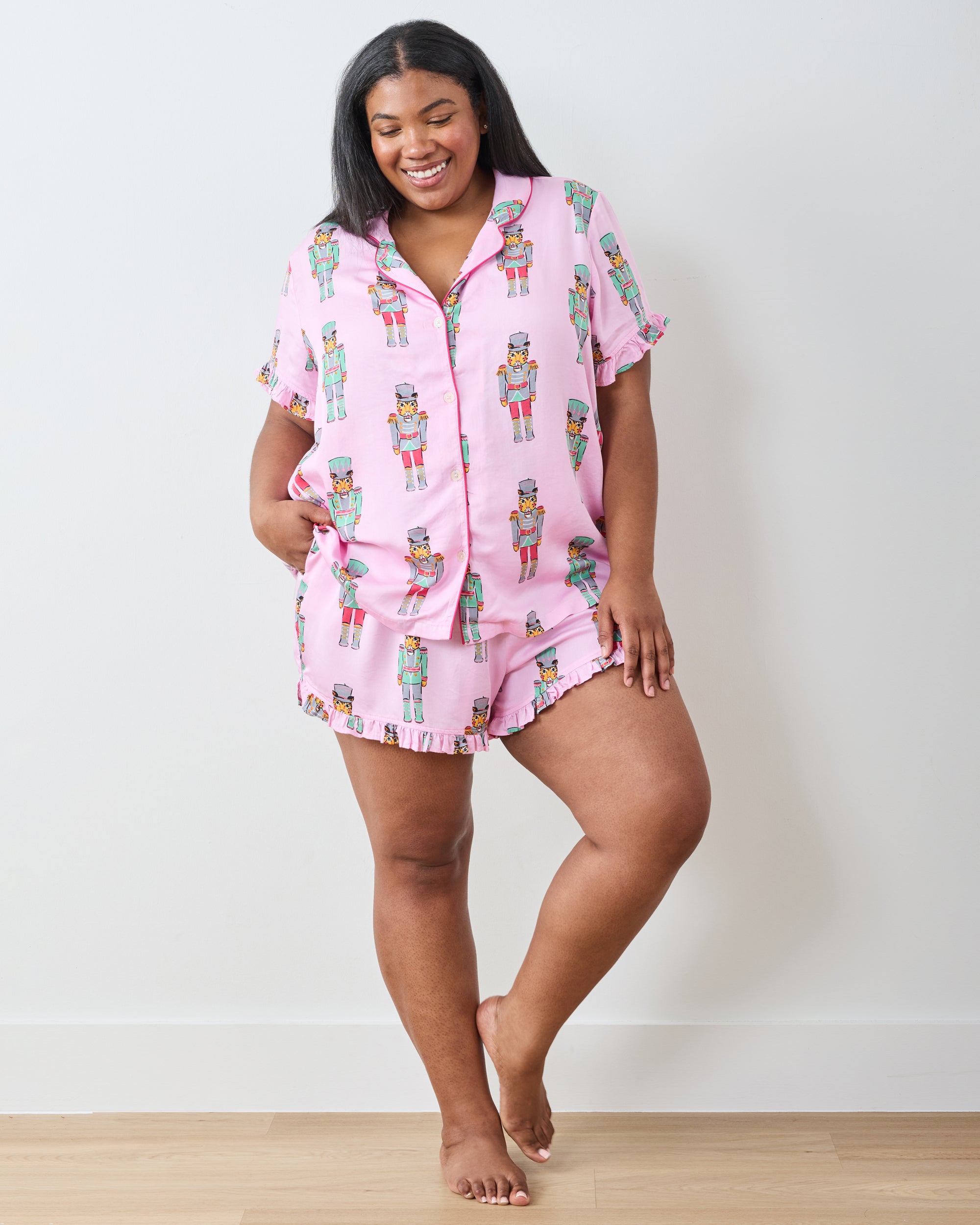 Pounce into the holiday spirit with our Leopard Nutcrackers satin pajama set in Pink Candy Cane. These satin ruffle pajamas feature big cats paired with whimsical nutcrackers on luxuriously soft Eco Satin. It’s festive satin sleepwear made for chic lounging, with playful ruffle details and pockets. Perfect holiday for gifting to cat lovers. Discover more delightful prints in our and .