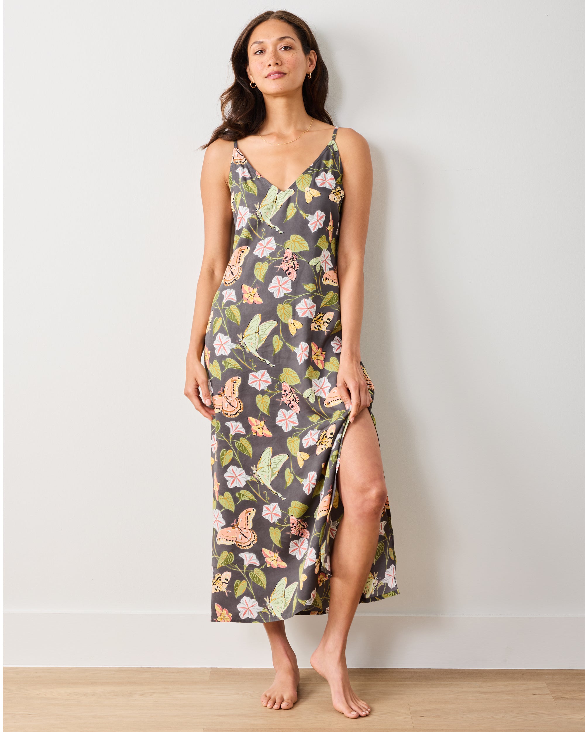 Enchant your evenings with our Midnight Flutter satin nightie in Slate. Colorful moths dance through leafy greenery on luxe Eco Satin, creating a nature print nightgown perfect for stargazing from your bedroom window. The midi length offers elegant coverage while adjustable straps and smocked back ensure a perfect fit. Explore our and .