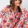 - Sizing: Button-down top with relaxed fit that’s roomy and chic. Mid-rise pants with elastic waistband, adjustable drawstring, and 28″ inseam.