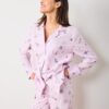 Greet the season in our October Traditions Halloween pajama set in soft Purple Spell. Embroidered jack-o-lanterns, witch hats, and seasonal icons dance across these purple pajamas. This cotton sleep set features a relaxed-fit button-down top and comfortable pants in breathable organic cotton. Perfect fall loungewear for cozy breakfast preparations. Please note, this style does not include pockets.