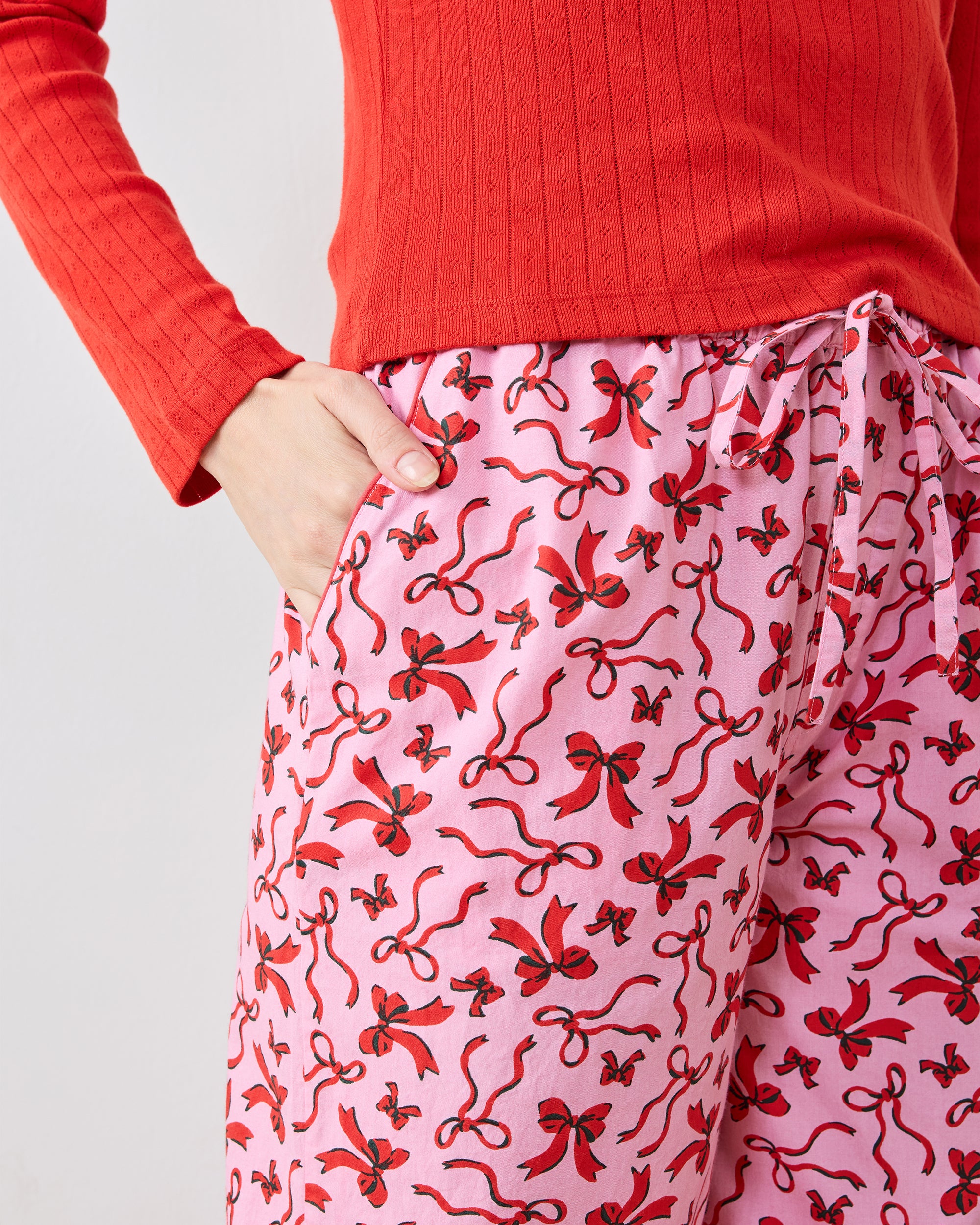 Wrap yourself in festive femininity with our Red Ribbons pink pajama pants. Featuring adorable preppy ribbons and bows on breathable organic cotton that gets softer with every wash, these cotton lounge pants offer a comfortable mid-rise fit with pockets for bedtime essentials. Cozy holiday PJ bottoms for watching Christmas movies with family. Explore our , , and for more joyful prints.