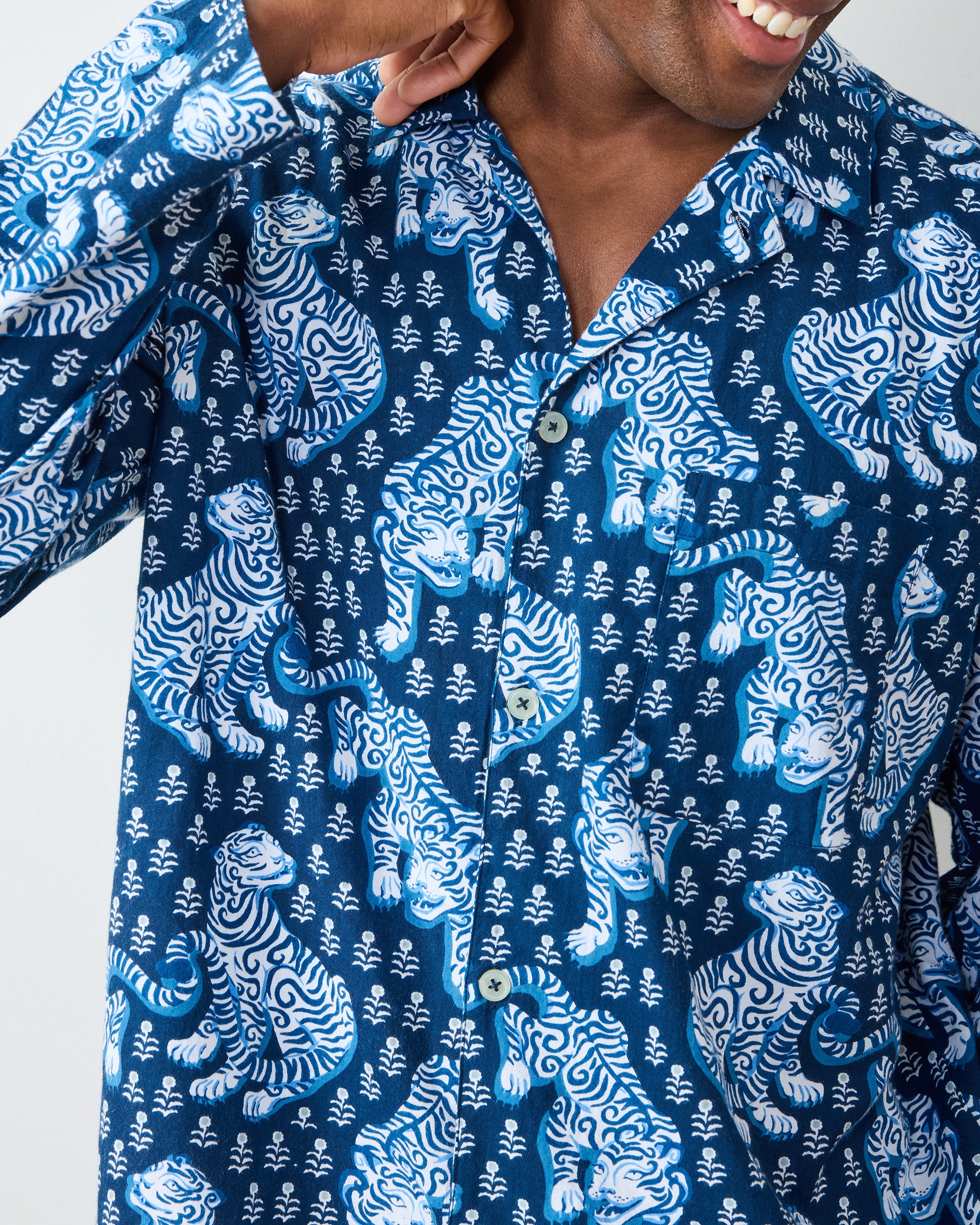 Relax in royal style with our Tiger Queen men’s flannel pajamas in Navy. This fierce print brings a sophisticated personality to cozy organic flannel, perfect for cool evenings. The roomy button-down top and relaxed-fit pants with pockets are the ultimate navy pajama set for weekend lounging. These tiger pajamas make a delightful gift for men who appreciate elevated sleepwear. Explore and for more prints.