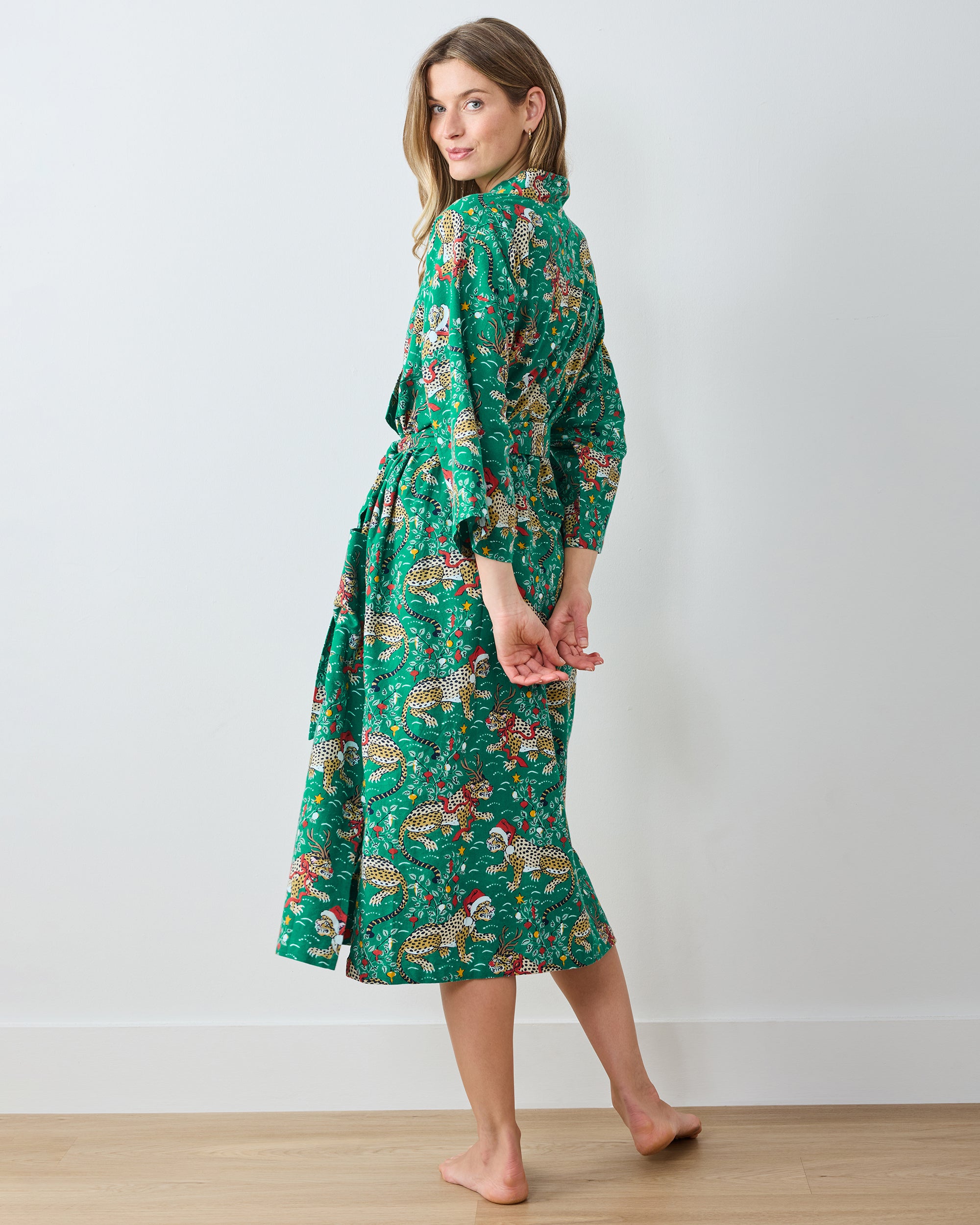 Ho ho ho, Bagheera’s ready for the holidays. Our Very Merry Bagheera holiday flannel robe features our beloved jungle cat sporting a Santa hat, Rudolph antlers, and a festive red nose on breathable organic flannel. This festive sleep robe offers luxurious full-length coverage with deep pockets and a coordinating belt for cozy holiday lounging. Discover more for gifting or layering over and .