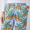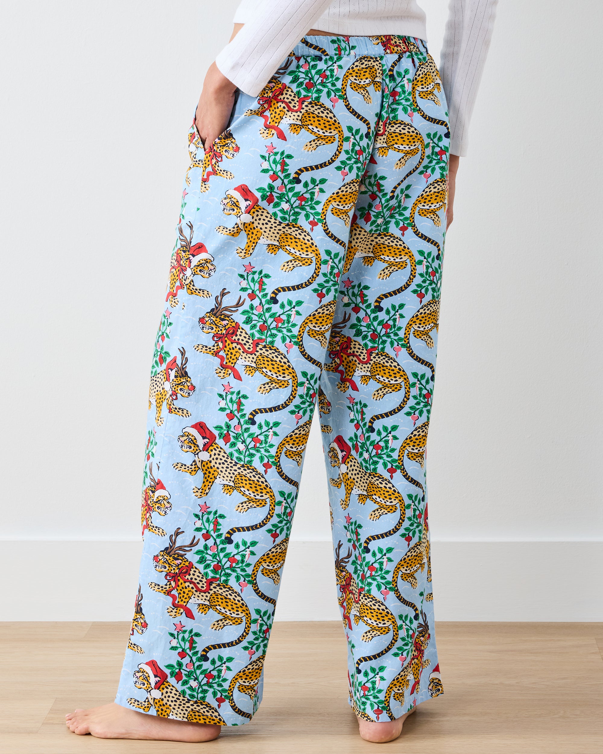 Meet your new favorite holiday pajama pants. Our Very Merry Bagheera cotton lounge pants feature our iconic sporting a Santa hat, Rudolph antlers, and a cheerful red nose on soft Pale Blue organic cotton. Flowy wide-leg holiday pajamas with a chic silhouette and comfortable length, complete with pockets. Cozy loungewear for festive relaxation. Find more delightful prints in our and .