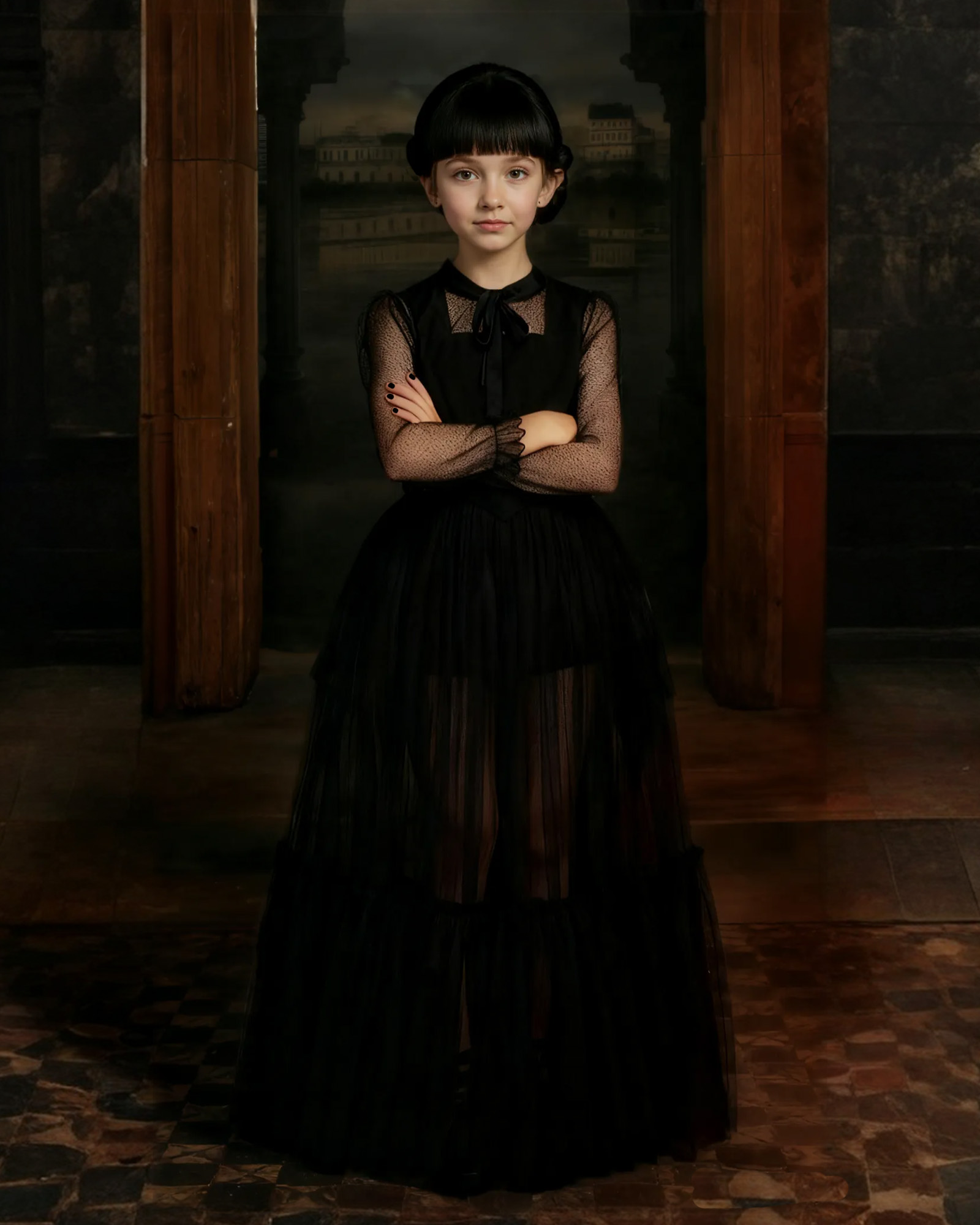 Wednesday’s style encompasses minimal tones, mainly Black in various shades, fabrics and silhouettes. Towards the end of the season we see Wednesday adorned in a maxi Black ruffled dress to prom. If you’re not a fan of all Black clothes, now is the time to divulge into it and explore a different look and if you are, you’re welcome.