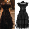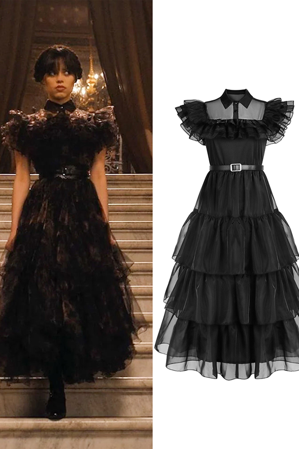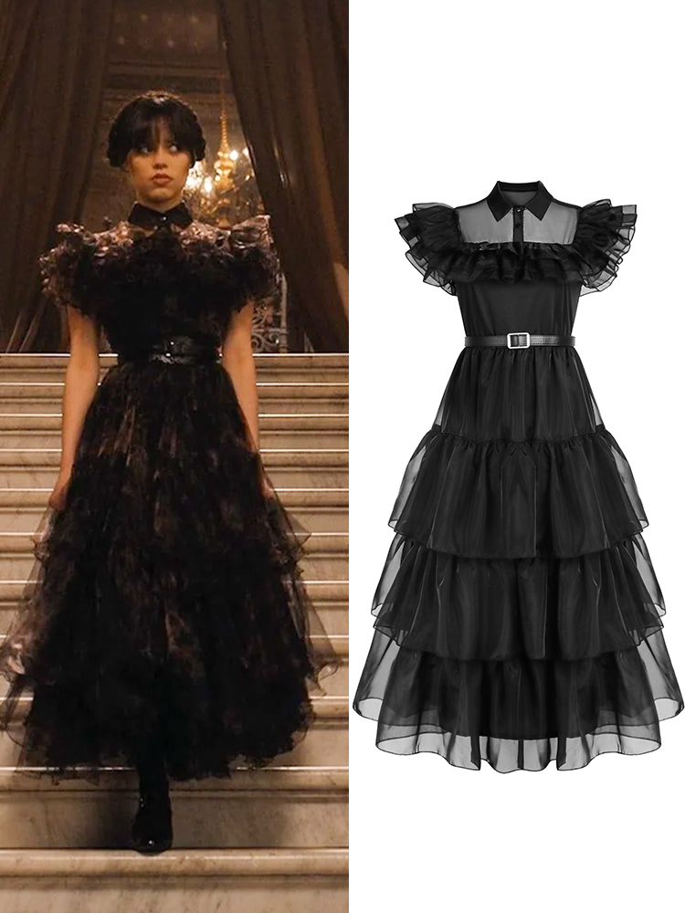 Wednesday’s style encompasses minimal tones, mainly black in various shades, fabrics and silhouettes. Towards the end of the season we see Wednesday adorned in a maxi black ruffled dress to prom. If you’re not a fan of all black clothes, now is the time to divulge into it and explore a different look and if you are, you’re welcome.