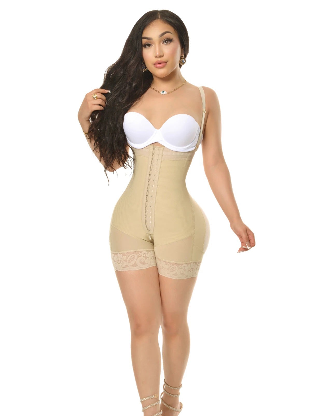 A strapless short-leg faja with removable straps, this faja comes with an extreme butt lift, high stomach compression, silicone band, and lace to prevent it from rolling up or down, perineal zipper for comfort when going to the restroom. Perfect for women with natural bodies