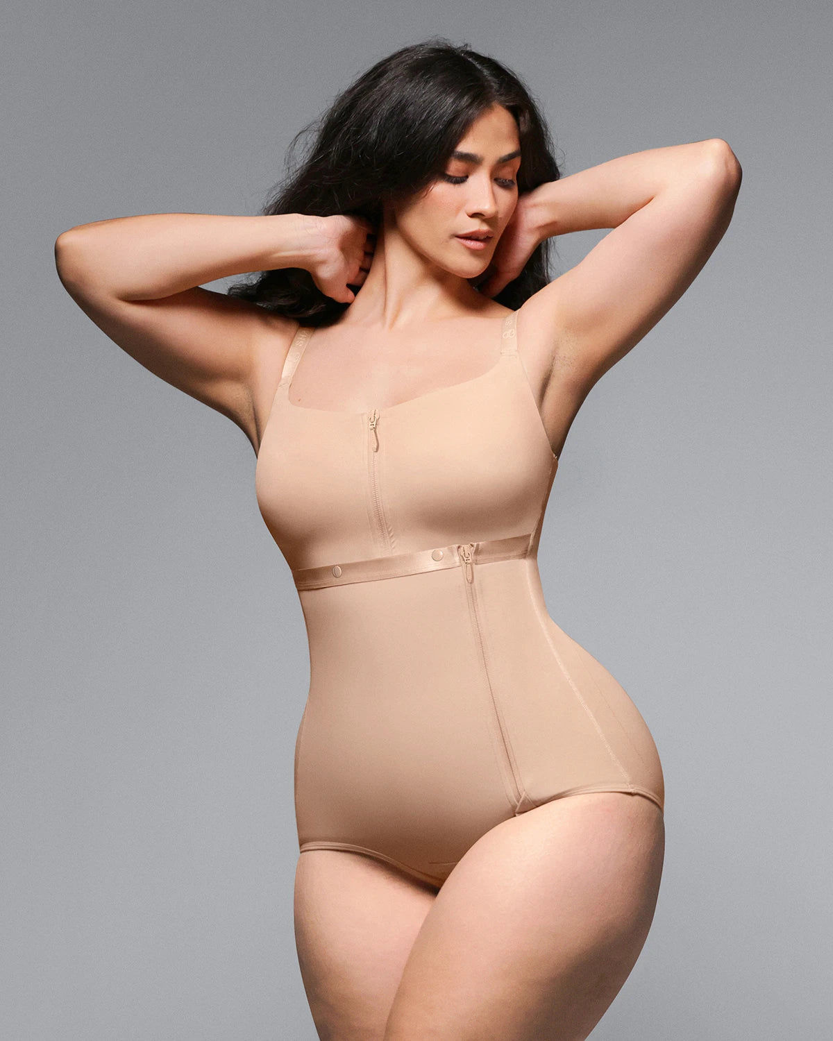 • Reinforced underbust band with snaps prevents gaping and bulging for seamless shaping.
