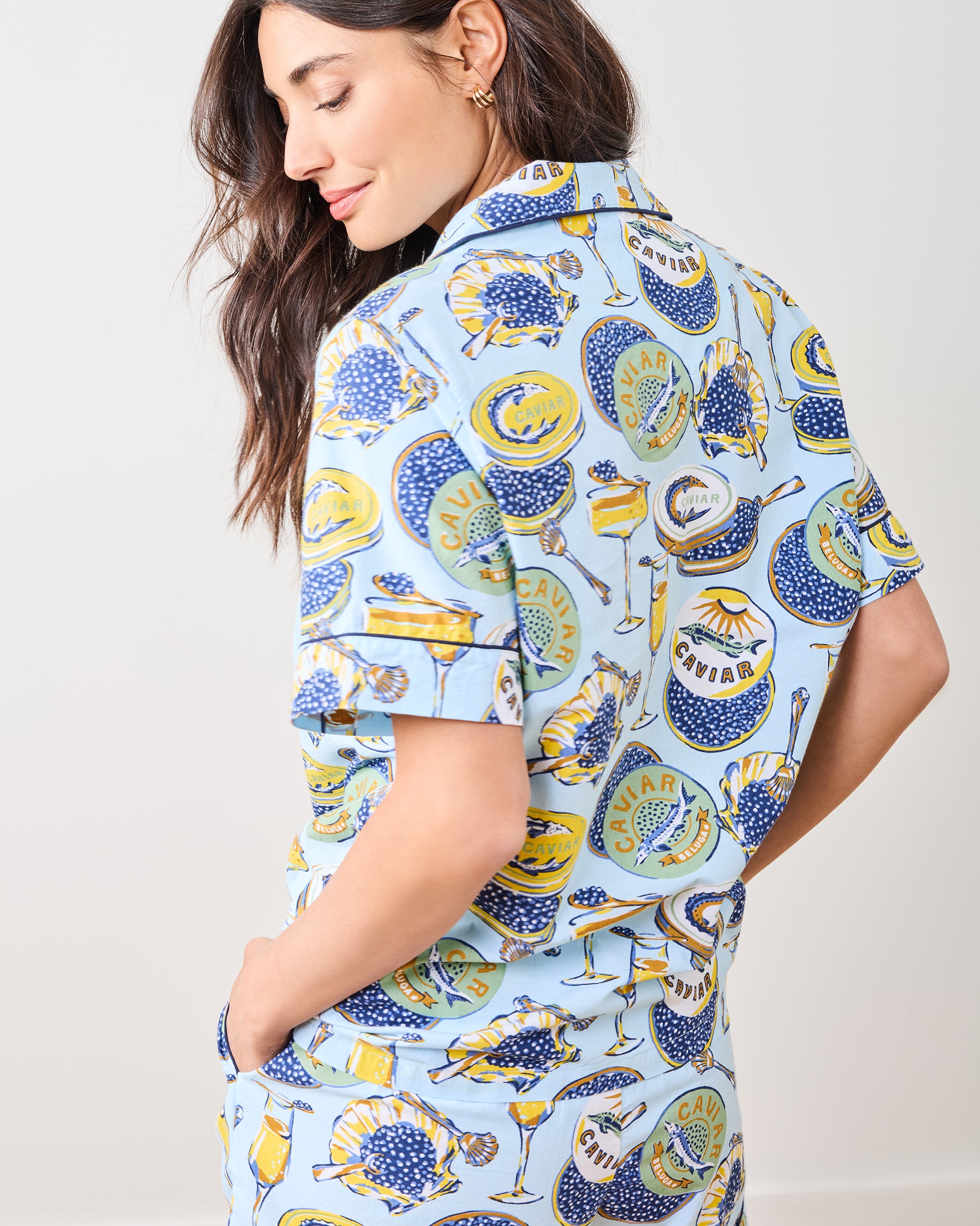 - The Pattern: Celebrate life’s luxuries and elevate your lounge with our Champagne & Caviar sleepwear capsule. Featuring both Eco Satin and organic cotton pajama styles, this lavish collection is perfect for those with an appetite for the finer things in life. With retro caviar tins and bubbly champagne flutes, it serves up total indulgence.