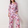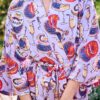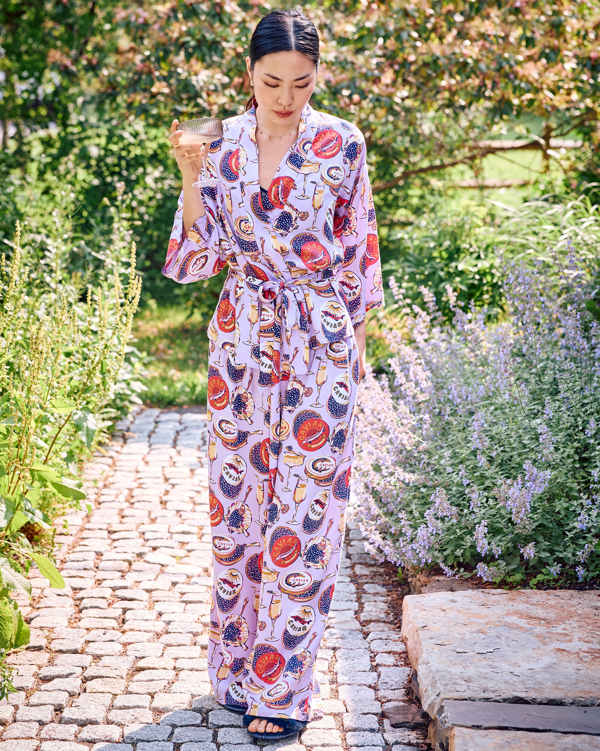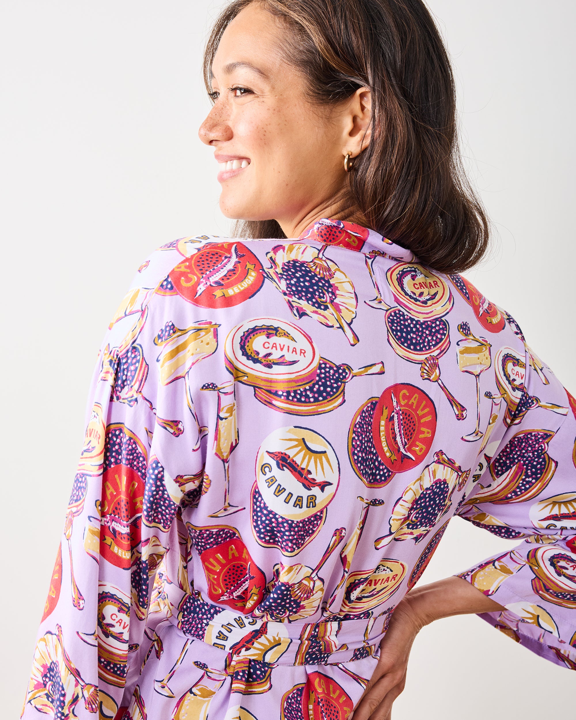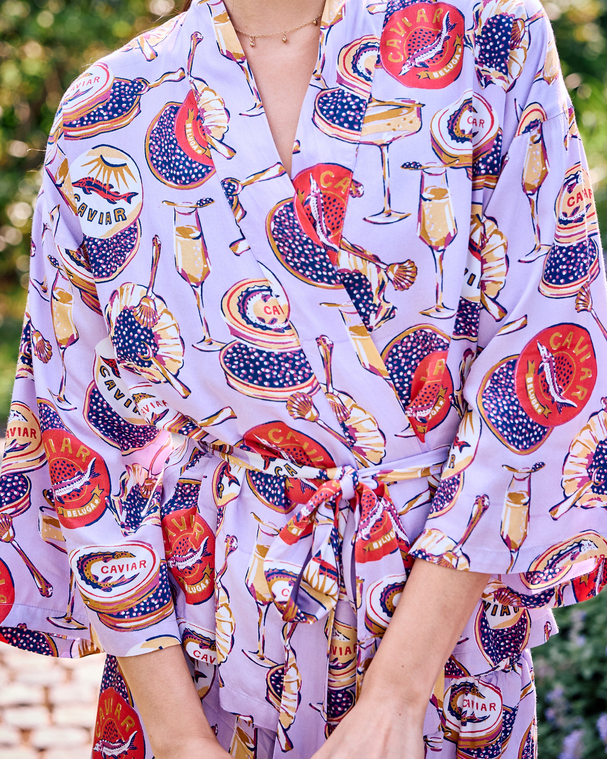 Toast to bedtime luxury in this champagne print sleepwear. Our satin Wrap Set features retro caviar tins and bubbly flutes on silky Eco Satin in sophisticated Lavender Spritz. The adjustable wrap top and wide-leg pants with pockets deliver relaxed comfort. Perfect for celebrating quiet evenings or gifting someone with exquisite taste. Discover more in our collection, , and .