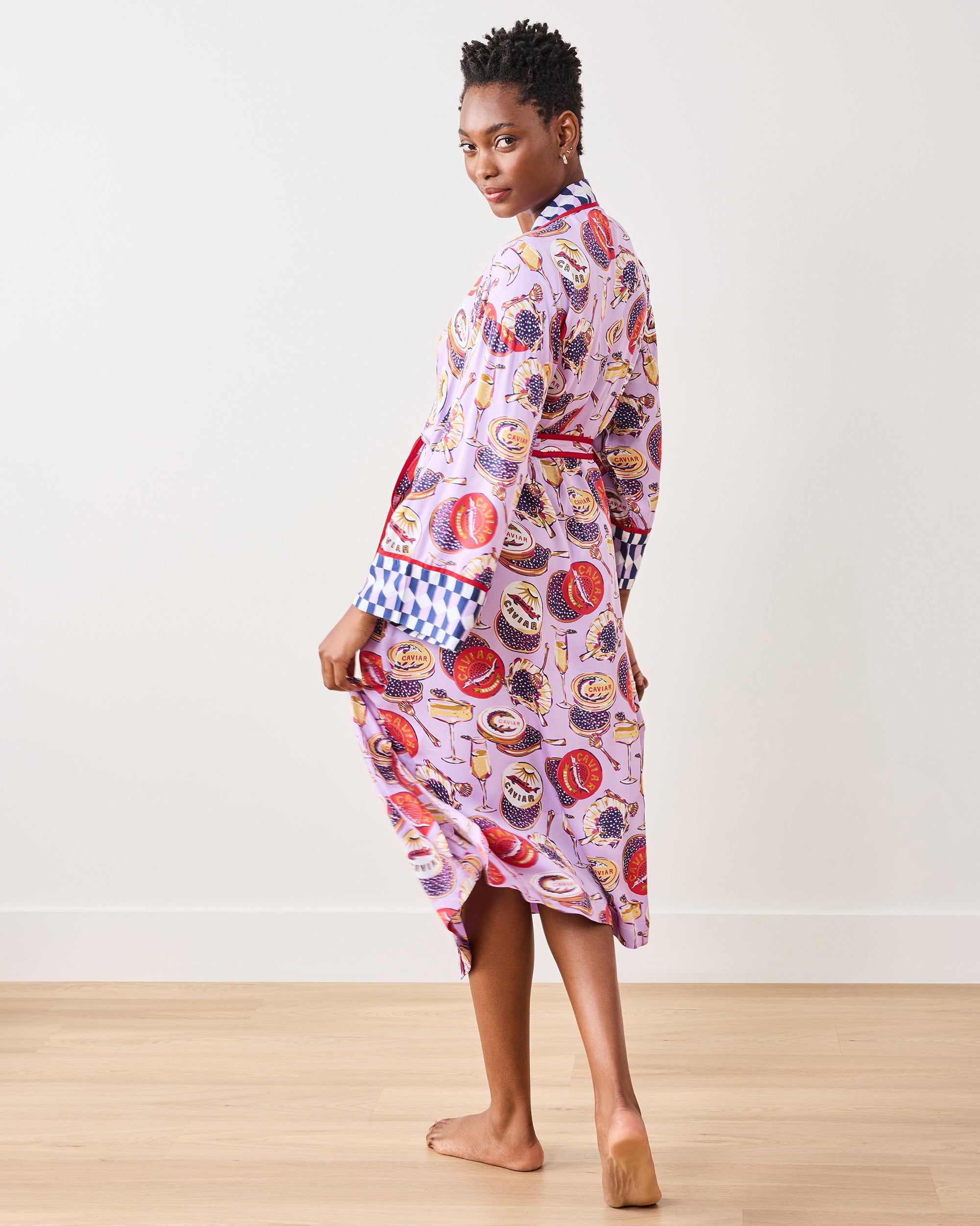 Celebrate with our Champagne & Caviar satin robe in Lavender Spritz. This champagne print sleepwear features hand-painted retro caviar tins and bubbly flutes on silky Eco Satin. The elegant full-length design includes deep pockets and dual closure options for your perfect fit. A luxury lounge robe made for champagne toasts at sunset or leisurely mornings. Explore more , and .