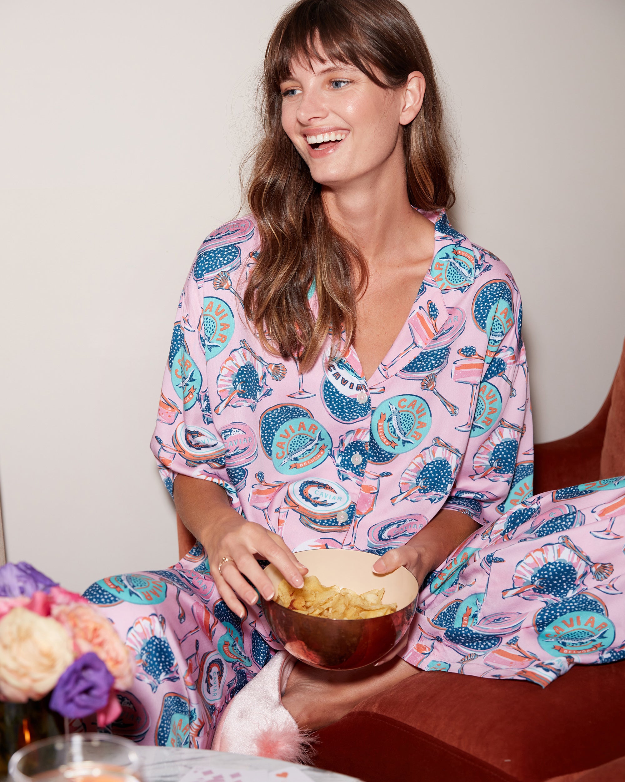 - The Pattern: Celebrate life’s luxuries and elevate your lounge with our Champagne & Caviar sleepwear capsule. Featuring both Eco Satin and organic cotton pajama styles, this lavish collection is perfect for those with an appetite for the finer things in life. With retro caviar tins and bubbly champagne flutes, it serves up total indulgence.
