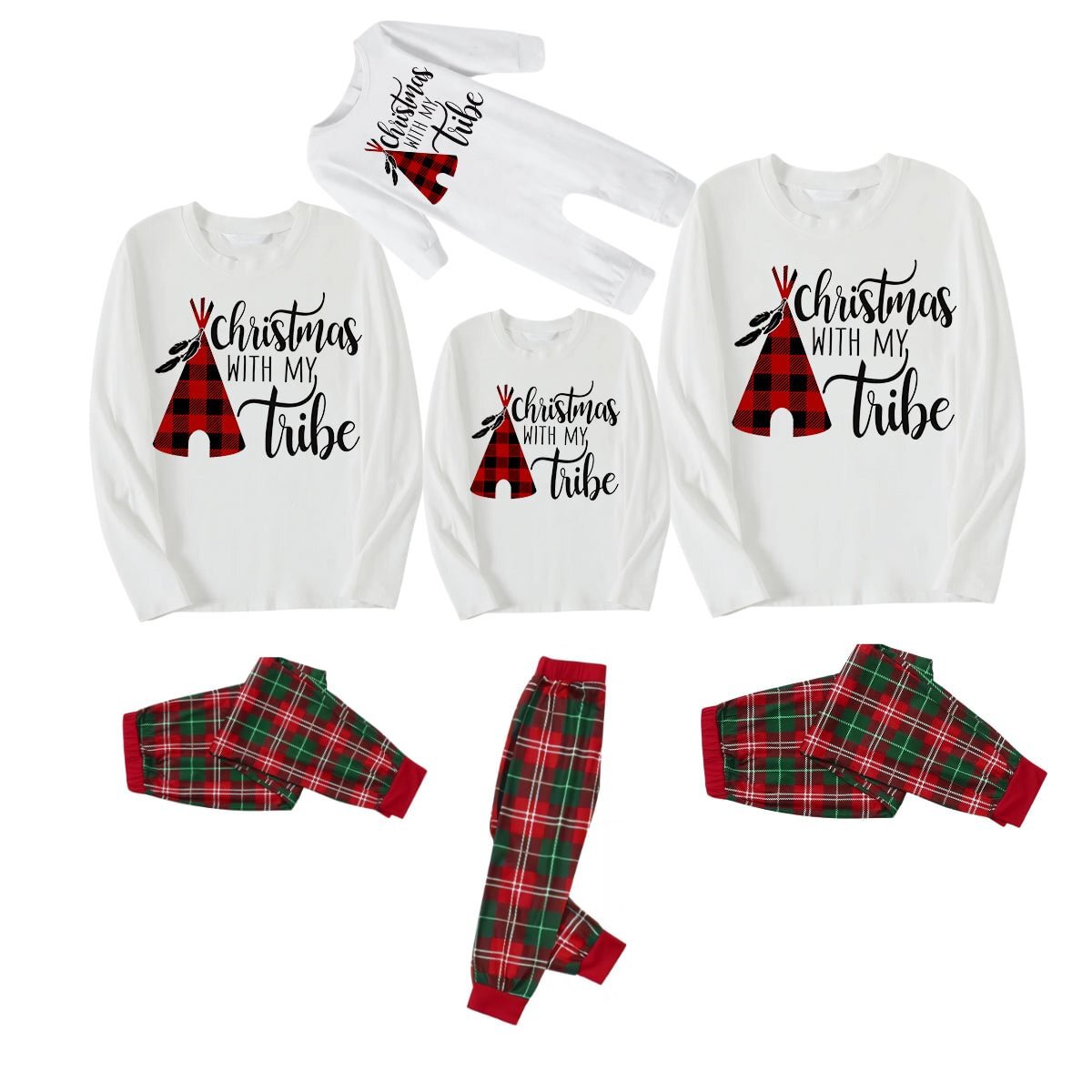 Christmas Letter Print Patterned White Long Sleeve with White&Red&Green Plaid Pants Family Matching Pajamas