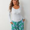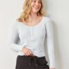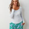 - Sizing: Shrunken style that fits snugly to the body. Body length skims the top of our signature pajama pants. Scoop neck and wide cuff detail.