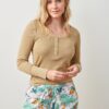 - Sizing: Shrunken style that fits snugly to the body. Body length skims the top of our signature pajama pants. Scoop neck and wide cuff detail.