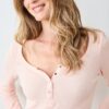 - Sizing: Shrunken style that fits snugly to the body. Body length skims the top of our signature pajama pants. Scoop neck and wide cuff detail.