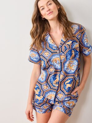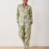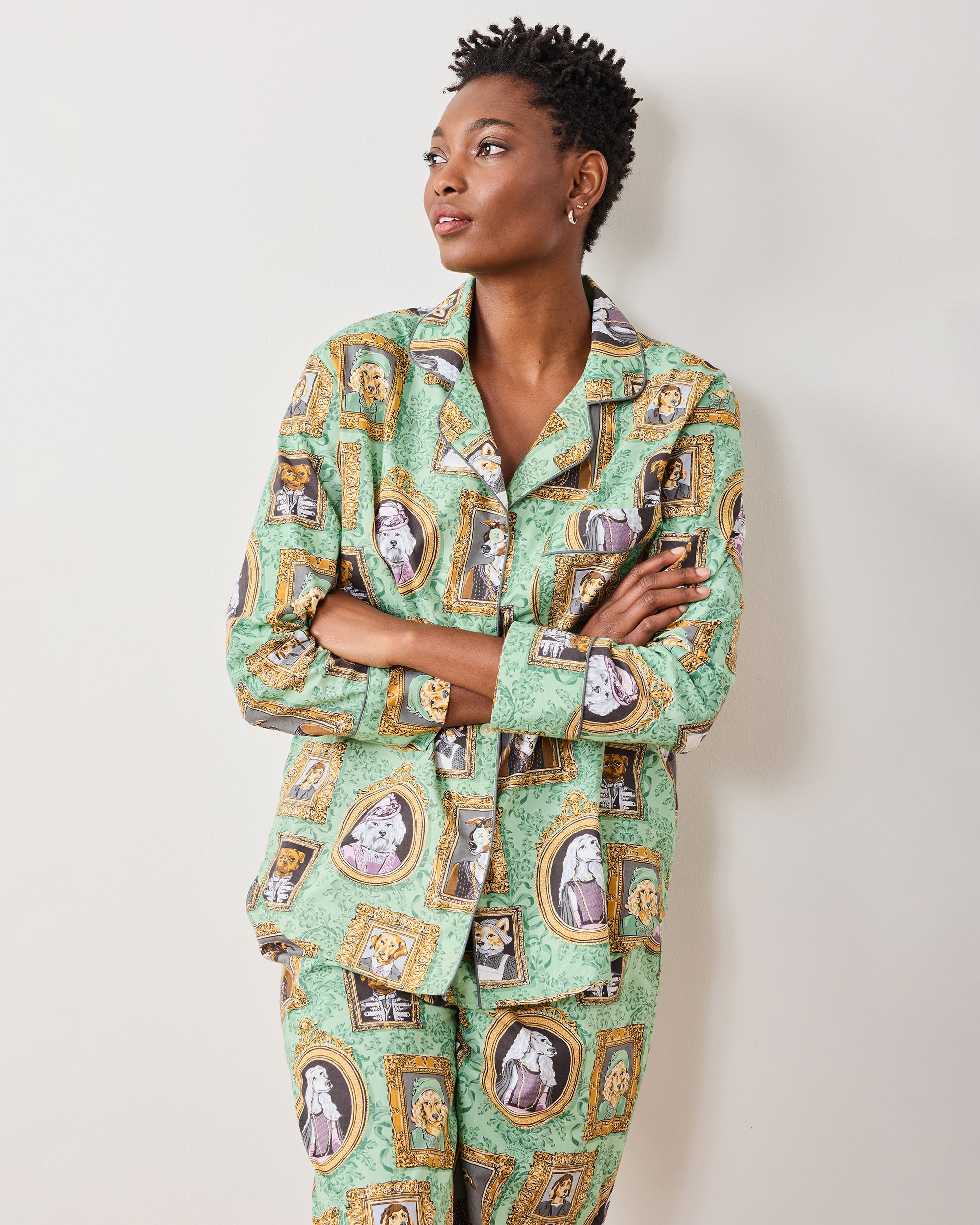 Transport yourself to a tail-wagging take on British aristocracy with our Dogton Abbey pajamas in Crawley Green. This whimsical collaboration reimagines the beloved series with dashing dogs, hand-screen-printed on breathable organic cotton. The relaxed-fit pajama set features a roomy button-down top and comfortable pants with pockets—perfect for evening strolls through your estate (or midnight snacks in the kitchen). Explore more long sleep sets and pajama sets.