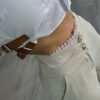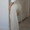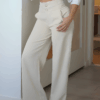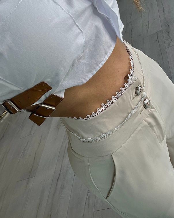 This high-waisted pants stand out with their waistband design, featuring lace details at the top and two heart-shaped buttons, adding a feminine and delicate touch. They drape lightly, providing movement and comfort.