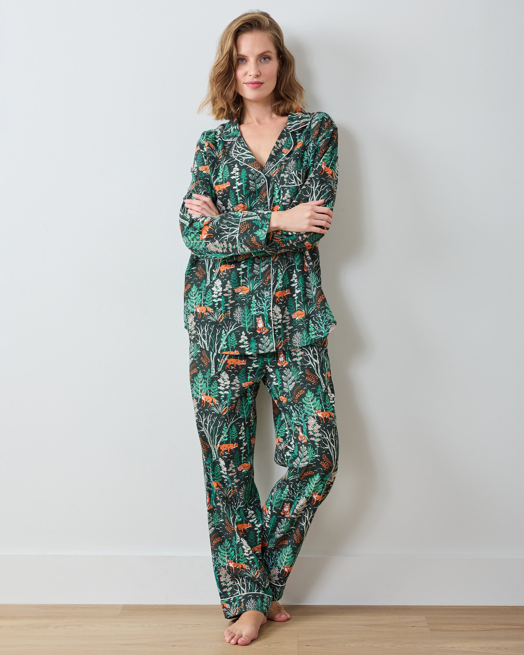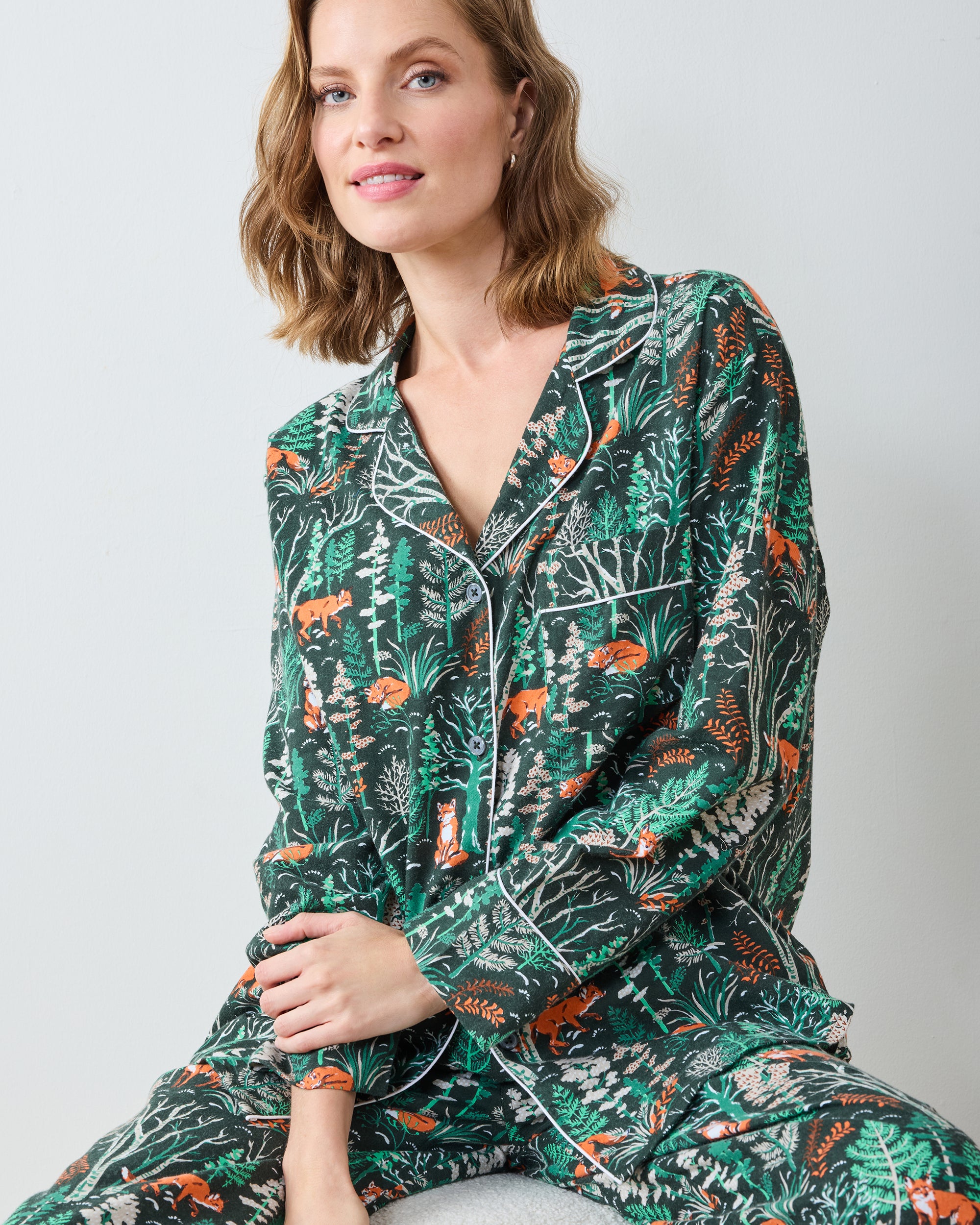 Straight from the pages of your favorite storybook, this flannel pajama set features hand-illustrated foxes frolicking in Juniper forests. Our flannel long PJ set offers a chic button-down silhouette and comfortable full-length pants with pockets. Crafted from breathable organic flannel, these woodland print pajamas make a delightful gift for nature lovers. Explore our and for more whimsical prints.