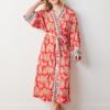 Bake up some holiday magic with our Gingerbread Party satin robe in rich Ruby. This conversation-starting holiday satin robe features delightful gingerbread motifs on silky Eco Satin. The long satin robe offers an effortlessly chic full-length silhouette, complete with pockets and an elegant matching belt. It layers beautifully over our . Discover more joyful prints in our and .