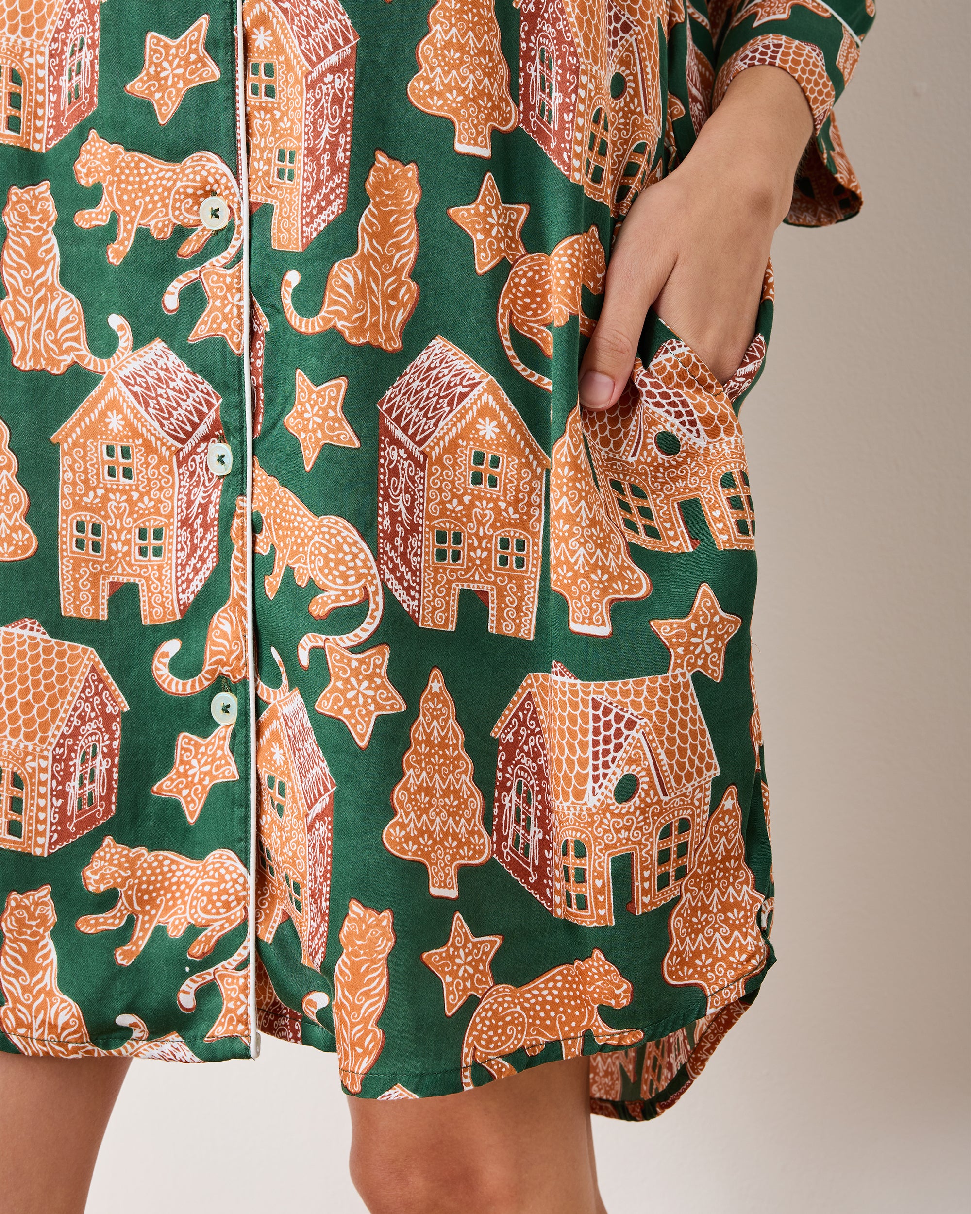 Bake up holiday magic with our Gingerbread Party satin sleep shirt in Hunter Green. This festive nightshirt features delightful gingerbread motifs on luxurious Eco Satin with button-front styling and convenient pockets. The relaxed silhouette offers effortless comfort for sweet dreams and cozy mornings. Our satin holiday nightie adds bold charm to your . Discover more styles in our and .