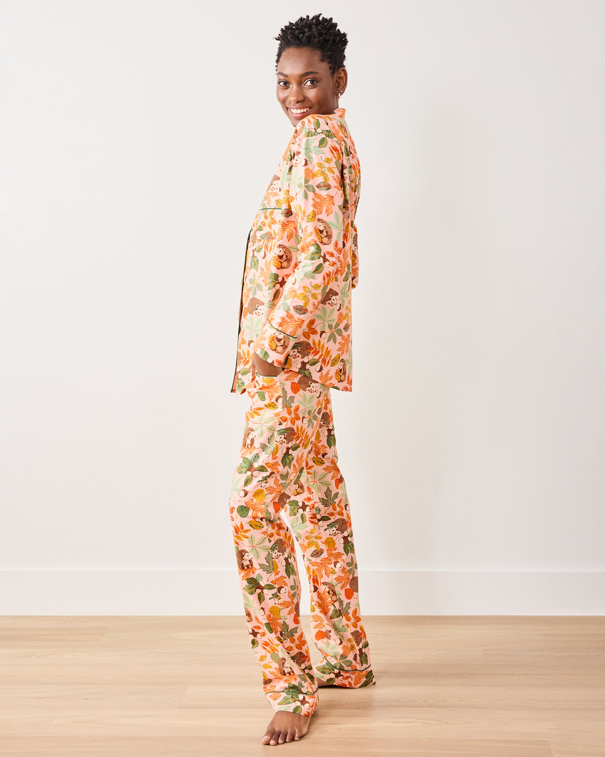 Get cozy with our Hedgehog Forest petite pajama set, featuring charming hand-drawn hedgehogs nestled among autumn leaves on breathable organic cotton. This hedgehog print pajama set offers a relaxed silhouette and comfortable fit, tailored for petite frames. With pockets for nighttime essentials, these fall pajamas are made for cozy nights and crisp autumn mornings. Explore more in our petites, pajama sets, and long sleep sets.
