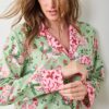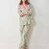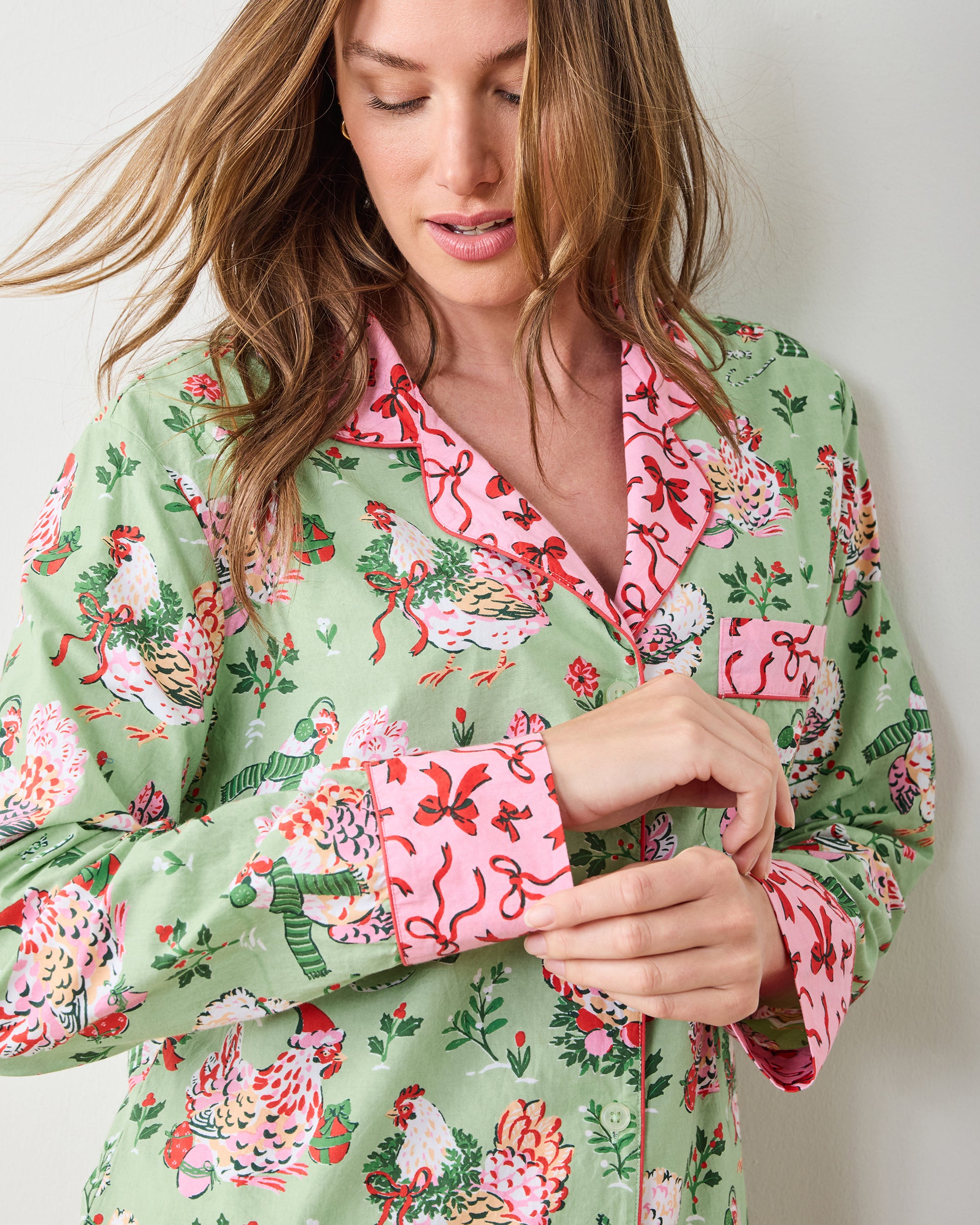 Celebrate the season with this holiday pajama set in Sage. These festive cotton pajamas feature adorable hand-illustrated hens sporting winter accessories like hats and scarves. The roomy button-down top pairs with relaxed full-length pants, complete with pockets. Crafted from breathable organic cotton, these festive long PJs are made for slow mornings sipping hot cocoa. Complete the celebration with our and .