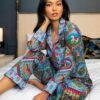 - Sizing: Button-down top with relaxed fit and comfortable silhouette. Mid-rise shorts featuring elastic waistband, adjustable drawstring, and 2 ¼” inseam.