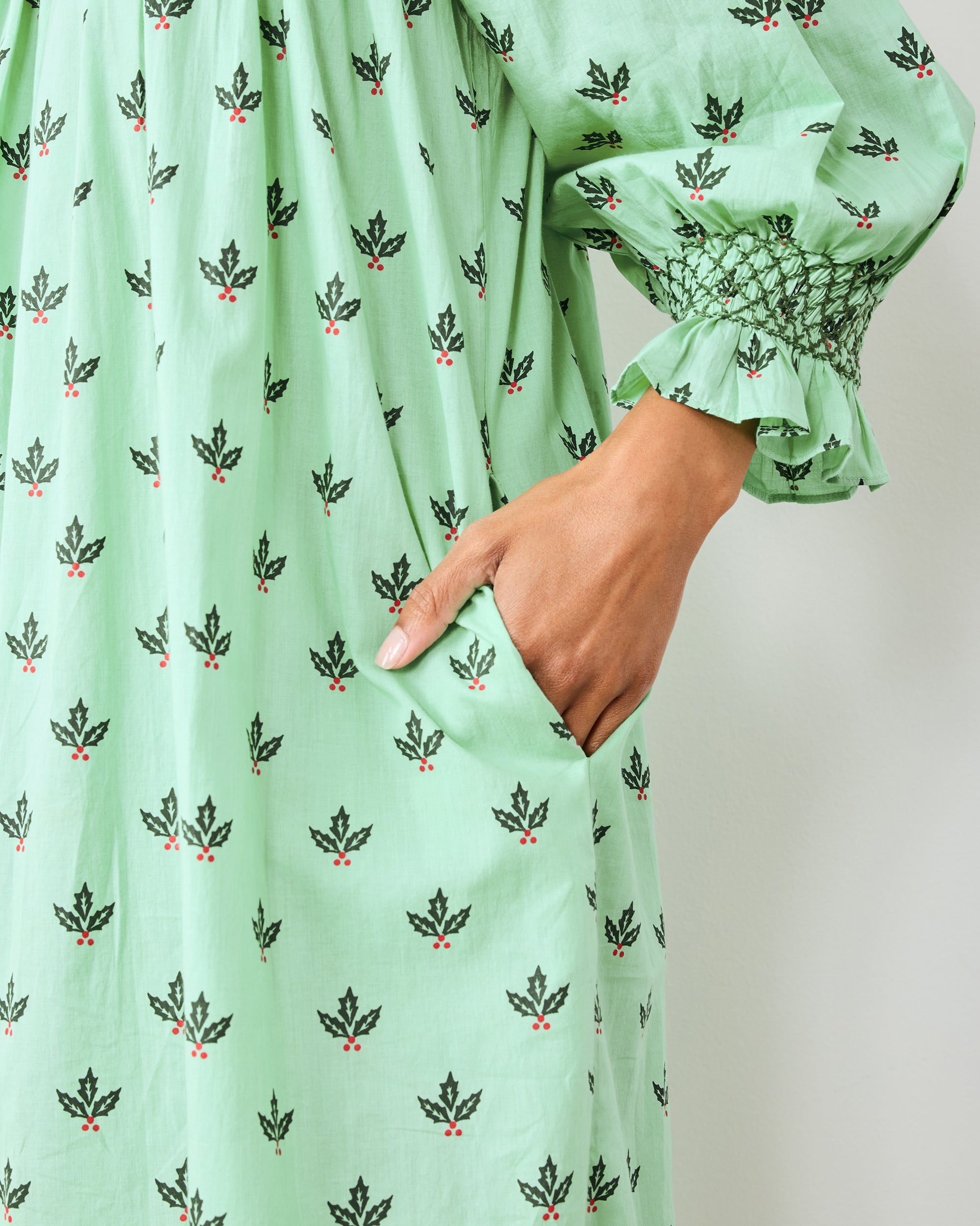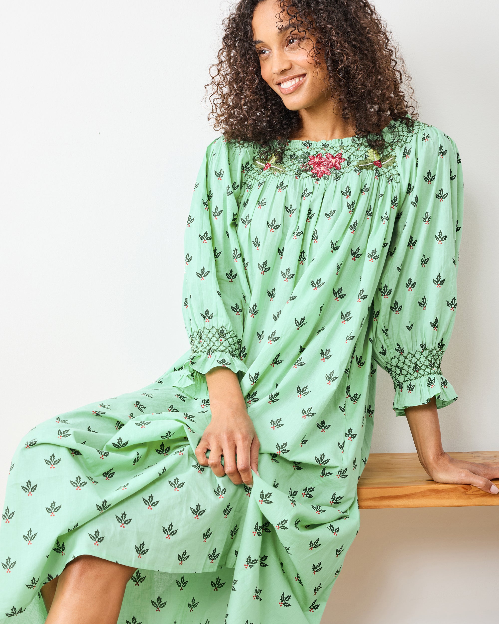 Deck your evenings with Holly Berry, with our Parker Nightgown in serene Sage. Delicate embroidered holly adorns a comfortable smocked bodice, while the sweeping maxi silhouette offers graceful coverage. Crafted from breathable organic cotton cambric with deep pockets, this holiday nightgown is perfect for Christmas morning magic. A festive cotton nightdress for cozy December nights. Discover more hand-drawn prints in our , , and .