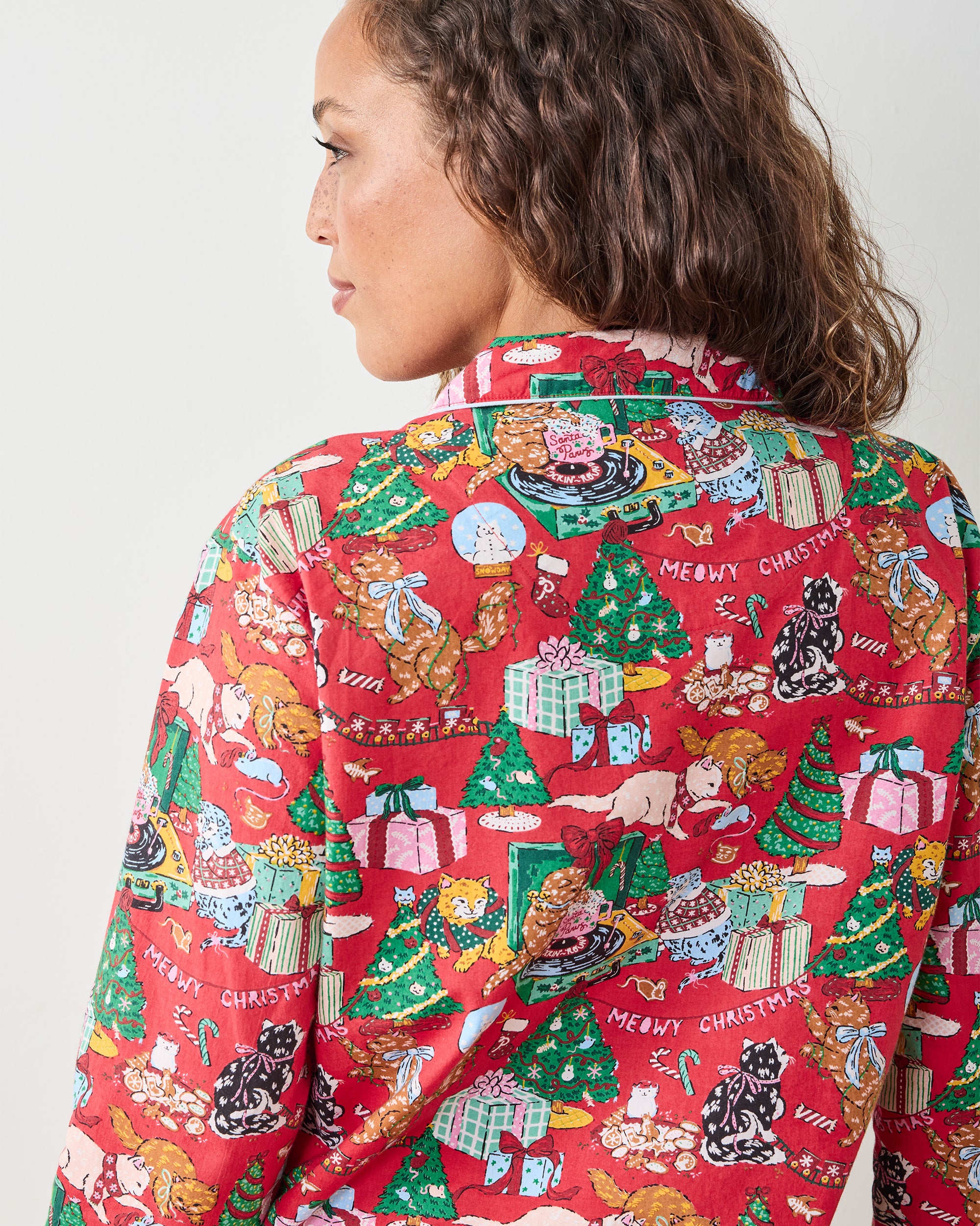 Deck the halls with feline festivities in our hand-drawn Meowy Christmas print. This Christmas long PJ set features holiday cats decking the halls across breathable organic cotton poplin. The button-down top offers a chic silhouette, while full-length pants include pockets for easy lounging. Delightful holiday cat pajamas for the friend whose pet has a Christmas stocking. Discover more styles in our and .