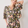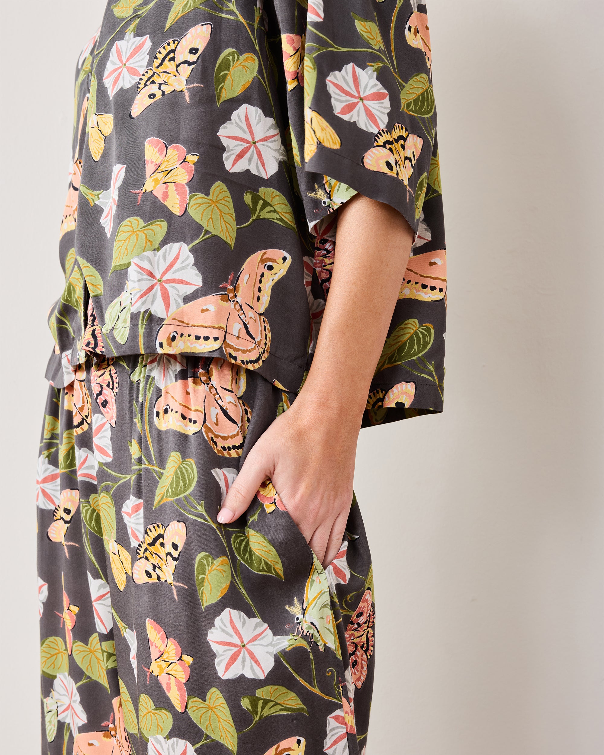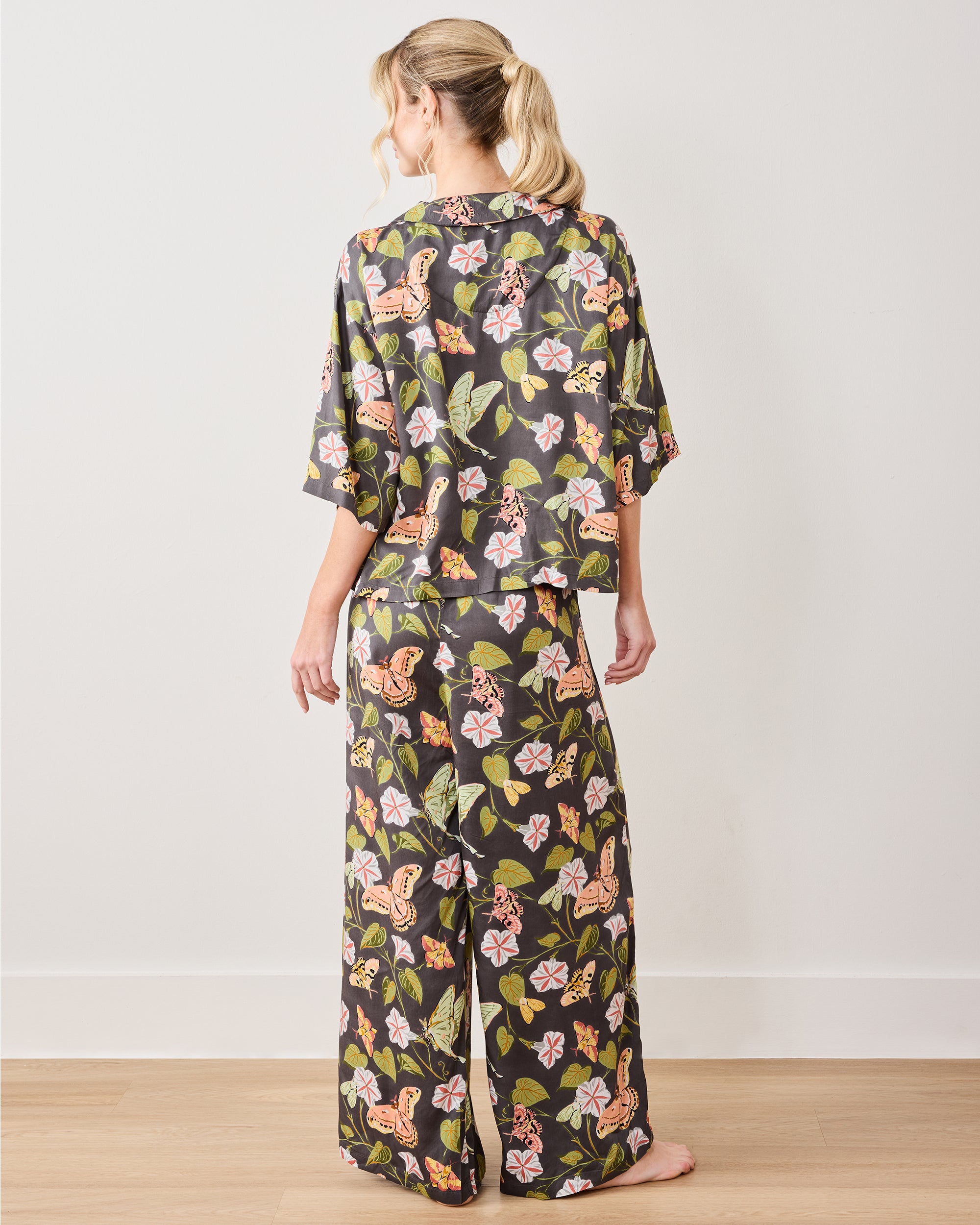 Moths dance through leafy greenery in our Eco Satin Wildest Dreams Midnight Flutter petite satin pajama set in Slate. The slightly cropped top features drop shoulders and high-rise, wide-leg pants with pockets, tailored for petite frames. This petite lounge set transforms bedtime into a nature-inspired dreamscape. Explore more , , and in magical hand-drawn prints.