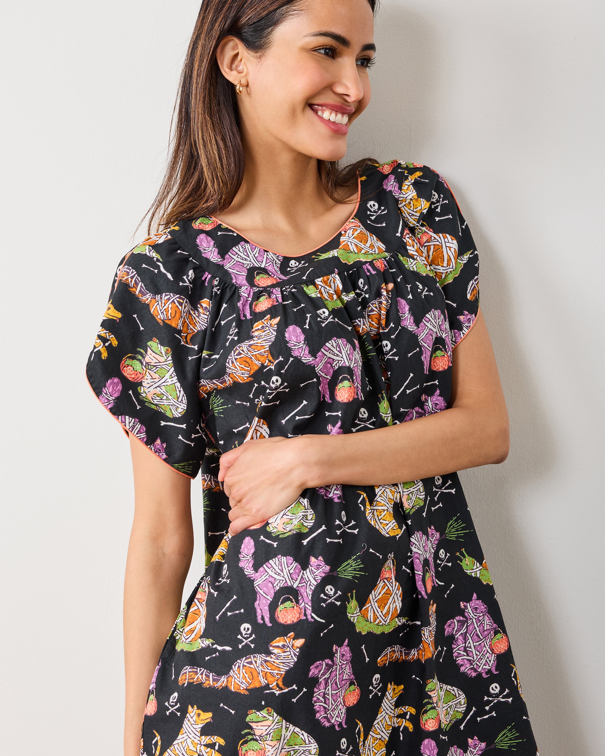 Embrace Halloween charm with a cotton nightgown in our playful Monster Mash print. Featuring critters dressed as mummies on a rich black background, this cotton nightie brings playful style to your evenings. The relaxed silhouette, comfortable mid-calf length, and deep pockets make it the perfect for Halloween sleepwear. Made for cozy nights in all autumn long. Find more seasonal prints in our nightgowns and pajamas.