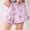 Bring seasonal charm to bedtime with our October Traditions ruffle shorts. These purple cotton lounge shorts feature embroidered jack-o’-lanterns and Halloweed icons on soft organic cotton. The ruffled hem and relaxed fit make them perfect for cozy evenings in or weekend pancake breakfasts. This embroidered style does not include pockets.