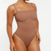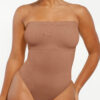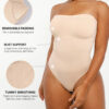 The Bare Essentials™ Skin Flow™ Strapless Sculpt Thong Bodysuit provides bust support, tummy flattening, and waist-cinching for a smooth silhouette. With pique stitching, a snap closure, and removable adjustable straps, this eco-friendly bodysuit ensures all-day comfort and seamless body sculpting.