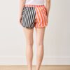 Bring dramatic flair to bedtime with our Showtime Stripes cotton lounge shorts in Skeleton Candy. This Beetlejuice-inspired print features bold black-and-white stripes in a split design with vibrant orange-pink. Crafted from breathable organic cotton with a comfortable mid-rise fit, playful ruffle hem, and pockets for your nighttime essentials. Perfect for theatrical dreamers and midnight curtain calls.